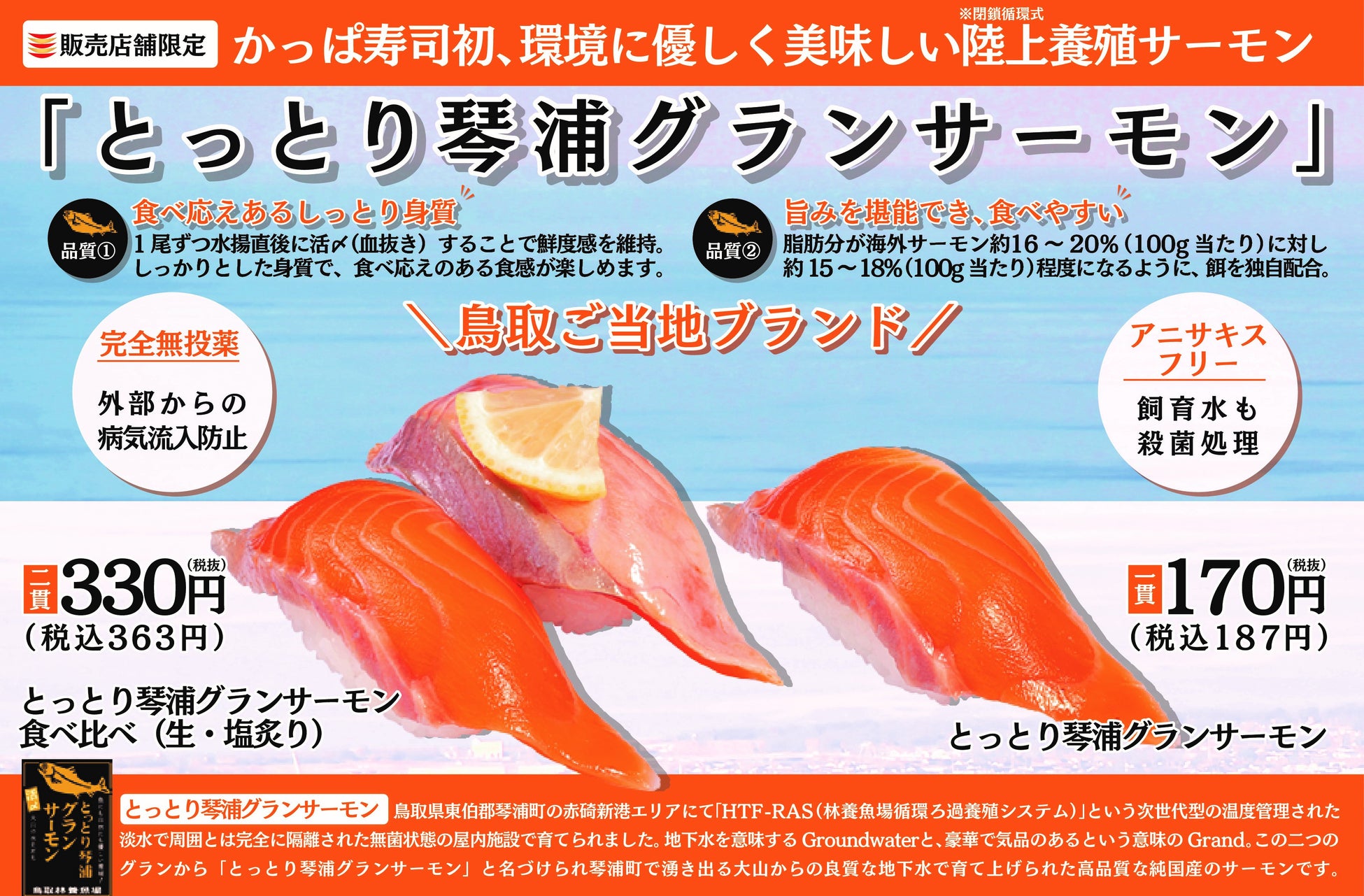 閉鎖循環式陸上養殖サーモンの取り扱いは、「かっぱ寿司」として初めてです。今回、同サーモンの販売は期間、店舗限定とはなりますが、最新の陸上養殖技術により環境負荷の軽減だけでなく美味しさも両立した「とっとり琴浦グランサーモン」を是非ご賞味ください。