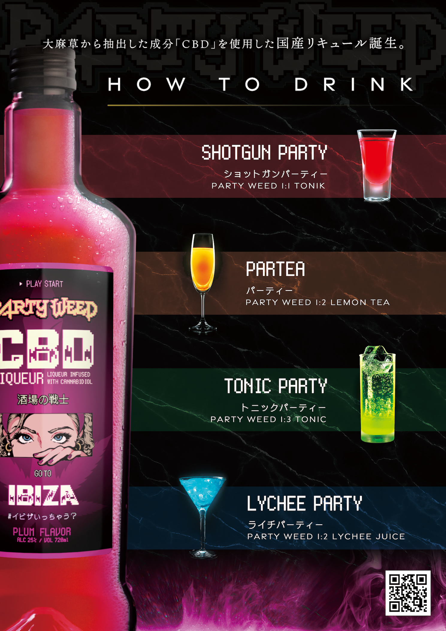 CBD配合パーティーリキュールである「PARTY WEED」は、最高の夜をさらに盛り上げるために誕生しました。その昔、戦場に出向いた戦士たちは戦いが終結した夜、大きな宴を開きました。勝利の美酒に酔いしれ、戦いの傷を癒し、誰が一番の大酒飲みか競いあったとも言われています。「PARTY WEED」はそんな酒場の戦士のために作られたパーティー酒です。最後まで立っていられるのは誰か!? #酒場の戦士