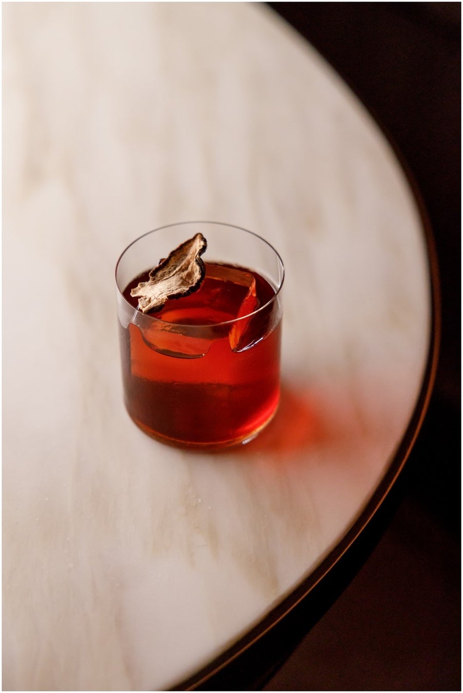 材料:Campari、Montelobos Mezcal Espadìn、1757 Vermouth Di Torino Rosso、Averna Adriatico roasted almond、ソルトシロップ、オレンジビター、ポルチーニ茸