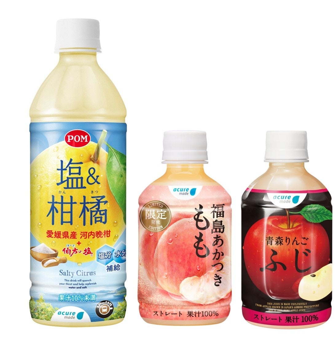 ①アキュアメイド果汁を使用した飲料(塩&柑橘・福島あかつき桃・青森りんごシリーズ)