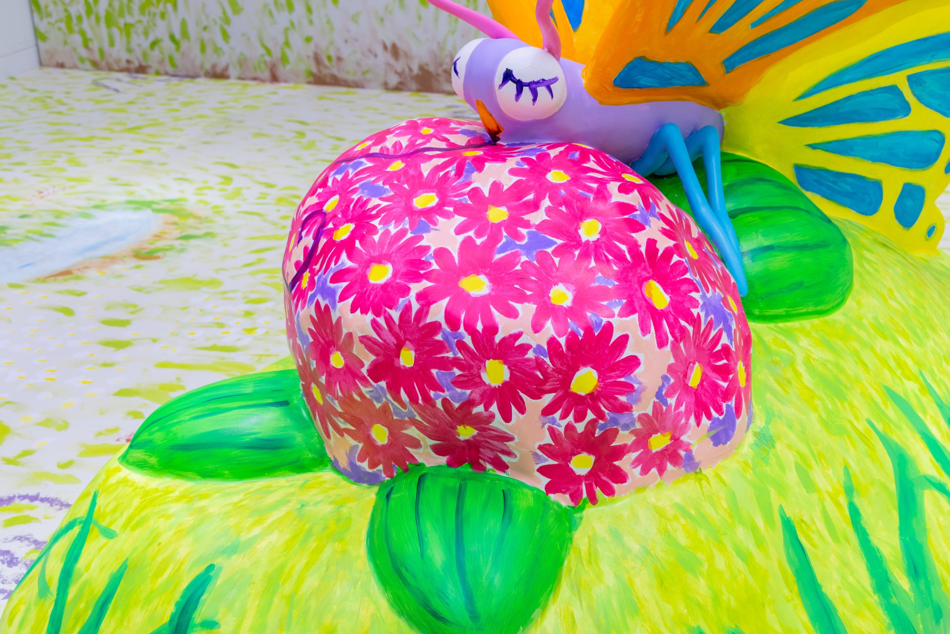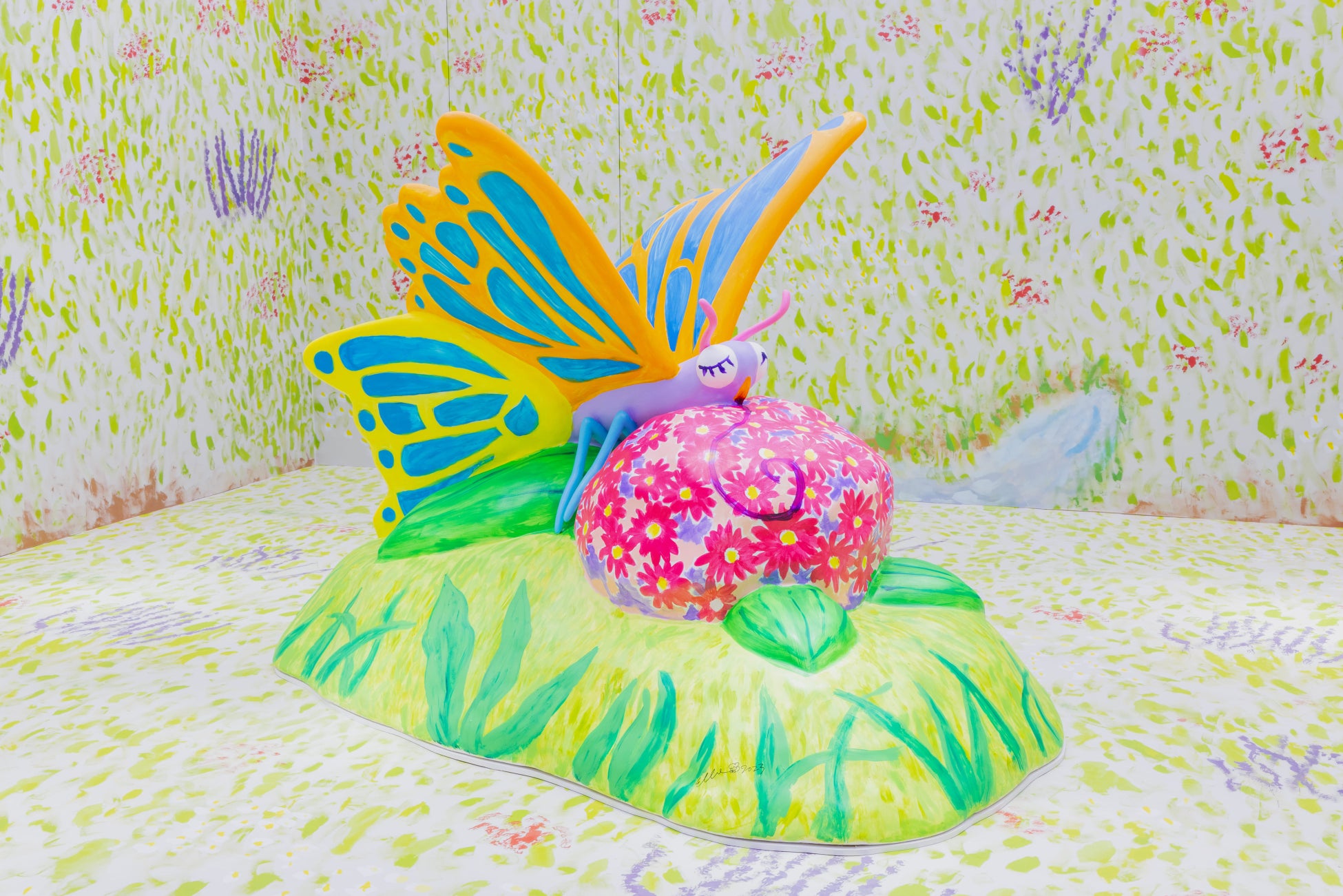 本アート展示のコンセプトは「島」。自然と生き物と人間が共に助け合って生きている島をイメージし、ガレージ中央には大きな立体の蝶々のオブジェを配し、大宮氏による草原の絵で壁面と床を埋め尽くした空間となっております。