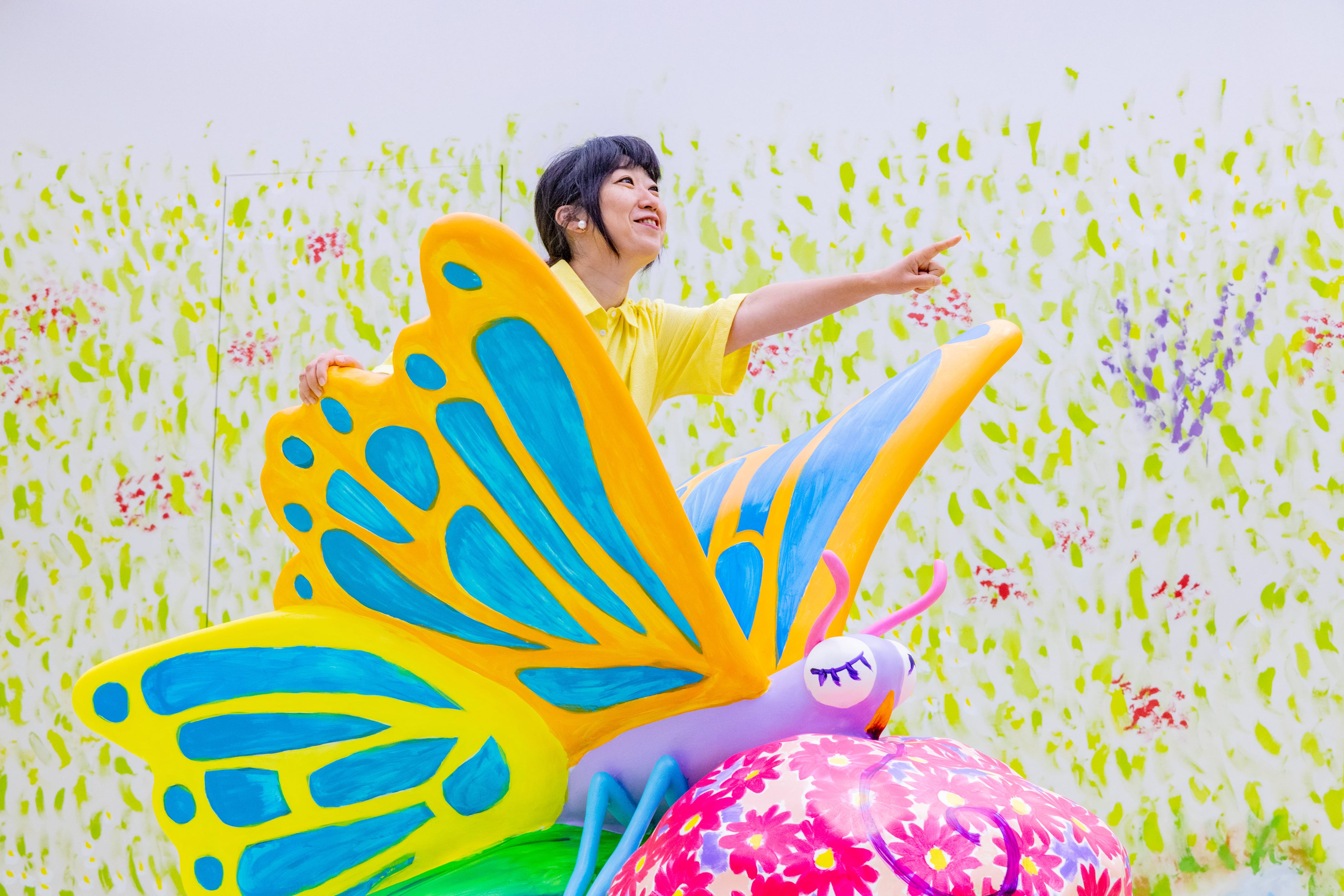 蝶々のオブジェは大宮氏の新作で、さらに「屋内空間×立体物」の演出は同氏にとって初めてのチャレンジとなります。夏の日差しが降り注ぐ島という空間の中で、オブジェに自由に触れて乗ることもでき、五感でアート空間の世界を楽しむことができます。