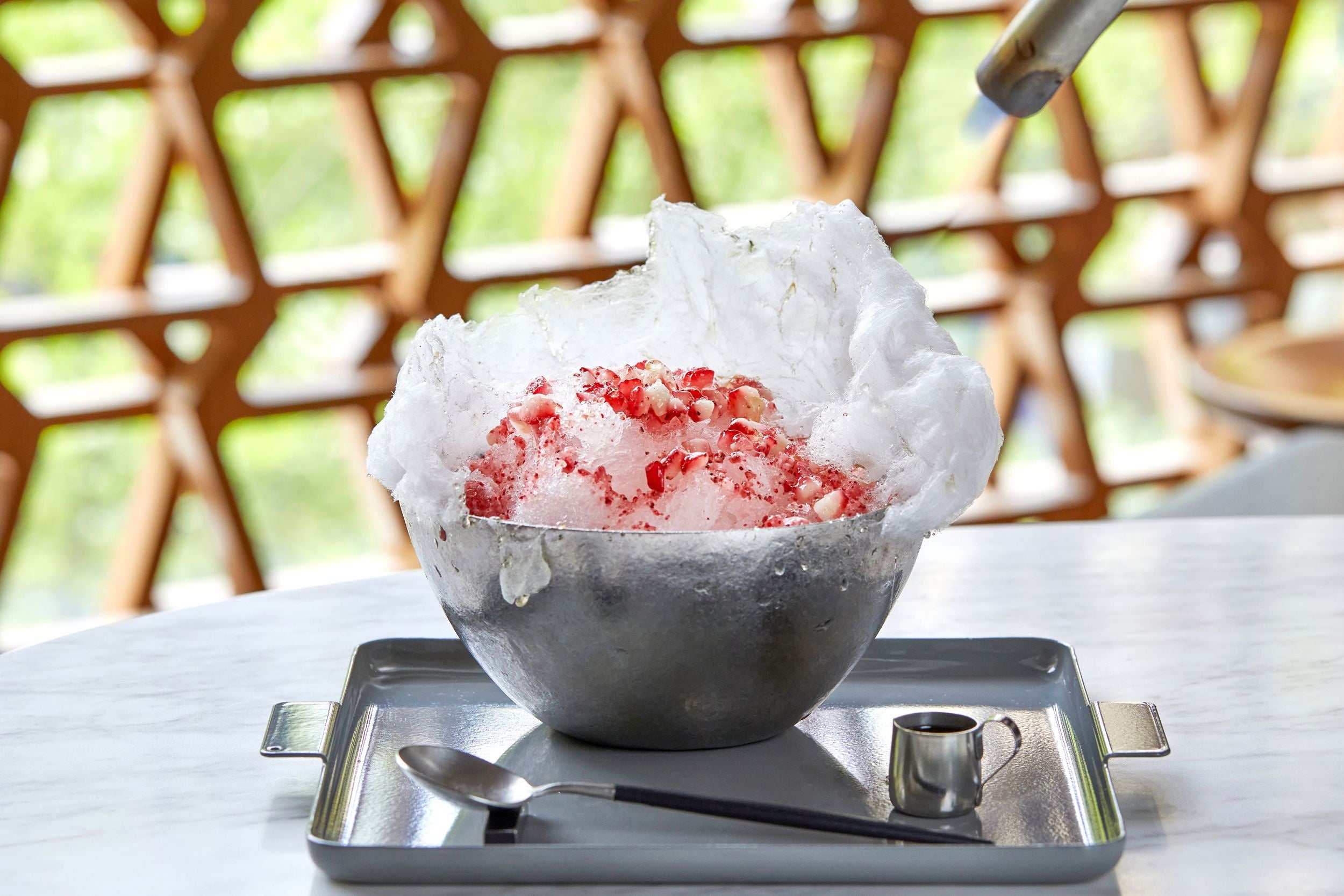 カカオパルプを搾った果汁のアイスクリームや苺が入った天然氷のかき氷の上に、