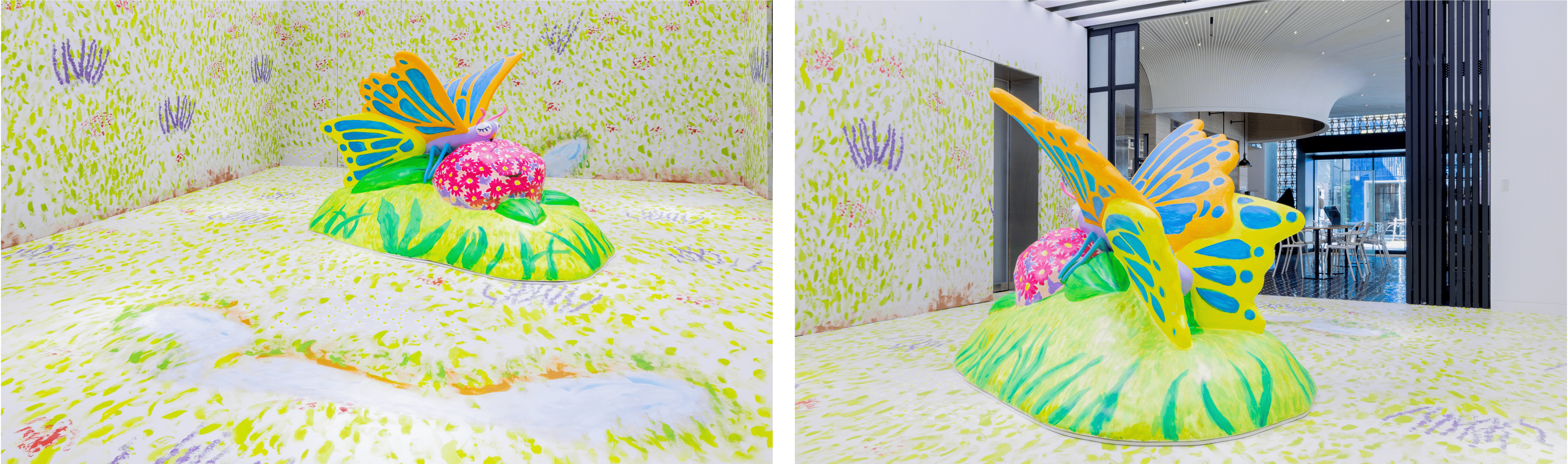 本アート展示のコンセプトは「島」。自然と生き物と人間が共に助け合って生きている島をイメージし、ガレージ中央には大きな立体の蝶々のオブジェを配し、大宮氏による草原の絵で壁面と床を埋め尽くした空間となっております。
