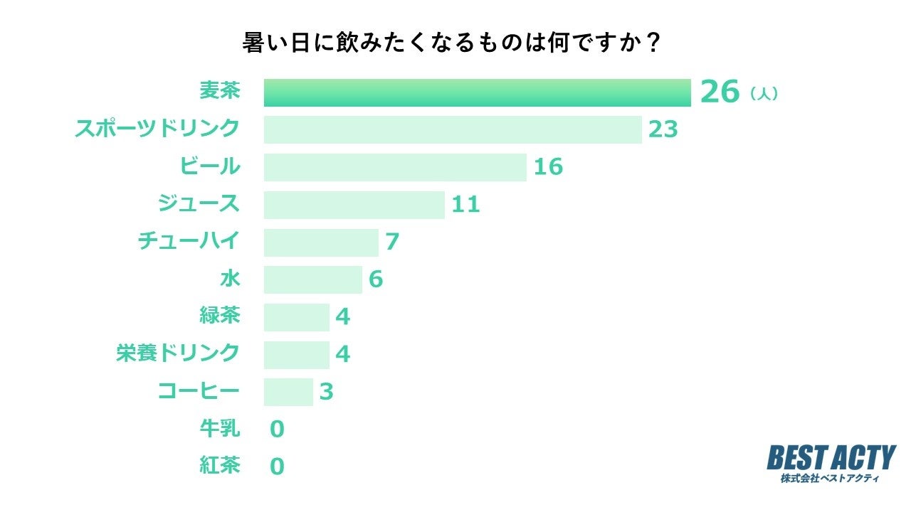 暑い日に飲みたくなるものについて100人にアンケートを行ったところ、「麦茶」と回答する人が最も多い結果となりました。