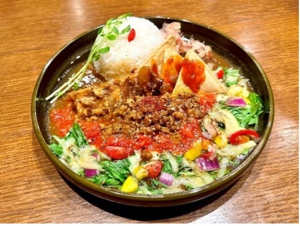 カレー屋だからできる1から開発したスパイスを効かせたオリジナルタコミートに、沖縄出身の店舗スタッフが故郷のおばあから譲り受けた秘伝のレシピで作った《ソーキ煮込み》。こだわりの鰹と昆布の大阪和風出汁カレー。食欲がわかない人でもスッキリ食べれるように、ピリ辛のトマトソースが味のアクセントになっています。
