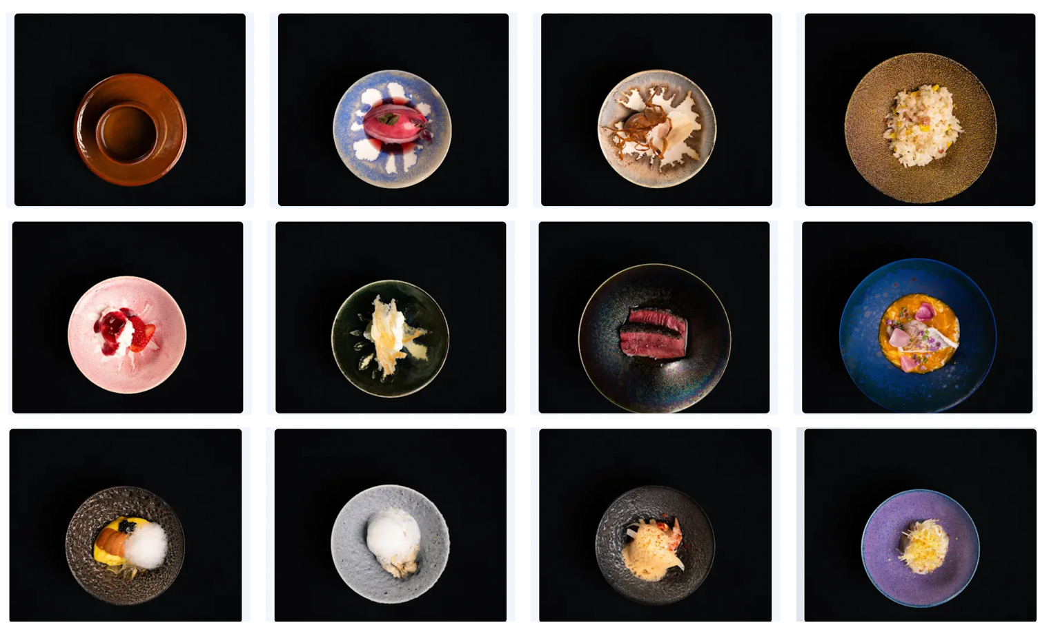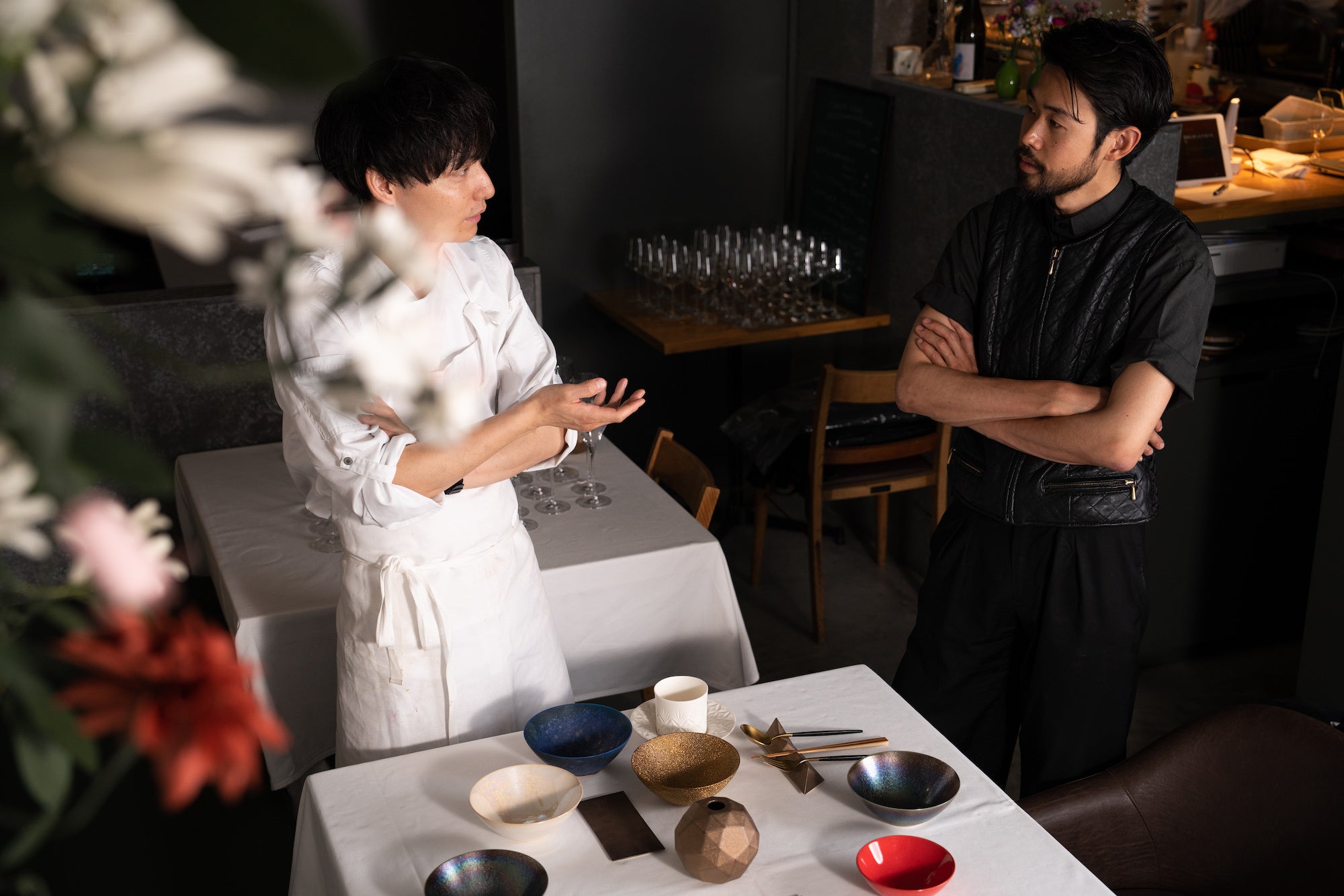 今年5月26日・27日の2日間限定で行われたコラボレーションイベント「彩食兼美」。陶芸家 宮下将太氏による個性溢れる20の作品に合わせて、20皿を考案したのは東京・四ツ谷に店を構える「ab restaurant」シェフの大村隆亮氏。このイベントで使用する作品を宮下氏本人が選び、どの順番で使うかなどは2人による話し合いで決められました。それをもとに一皿一皿どのような料理を供するか、シェフの大村氏がイベントのために一から考案しました。一つのコースでこれほど皿数が多いこも初めての経験であり、また食材からではなく器から料理を構築していくことも初めての試みだったようです。まさに全てがイベントのために尽くされたという限定感の極まる企画でした。