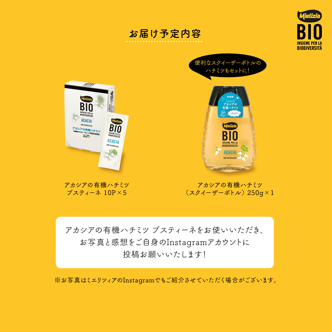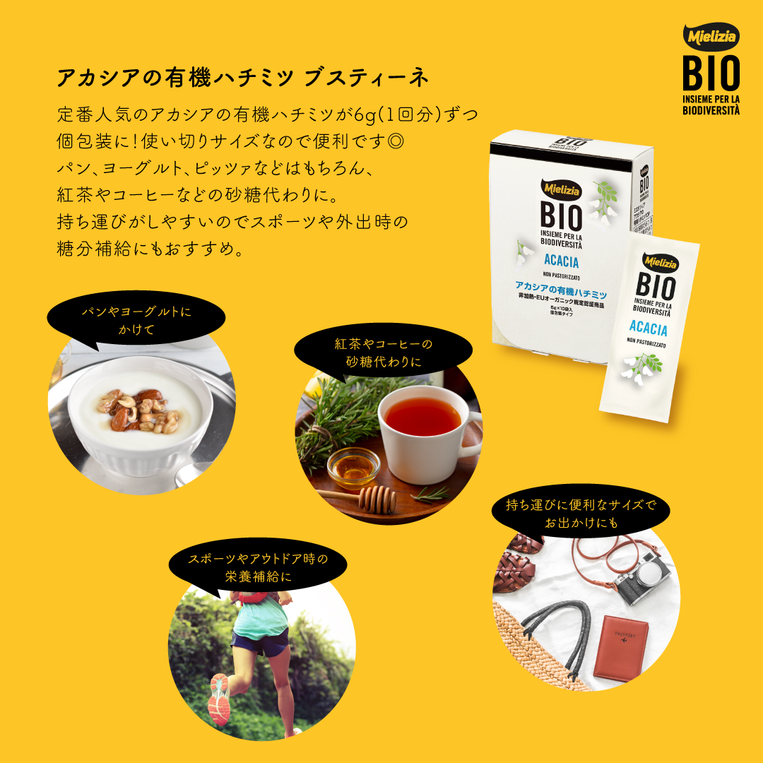 アカシアの有機ハチミツ ブスティーネ は、定番人気のアカシアの有機ハチミツが6g(1回分)ずつ個包装になった商品。便利な使い切りサイズです。