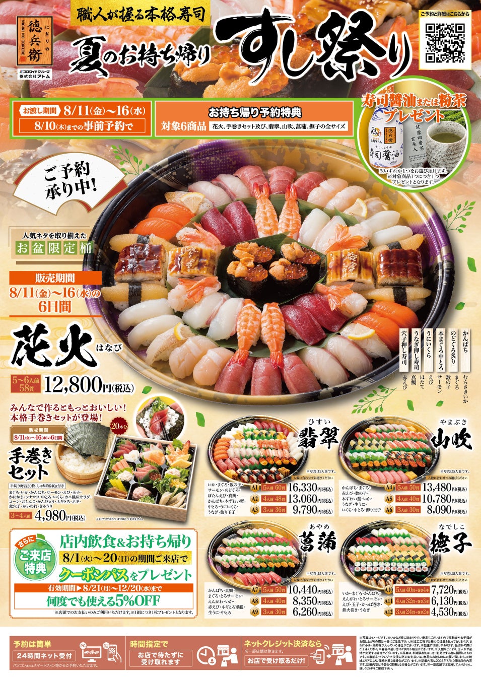 ネット注文&ネット決済していただくことで店頭での待ち時間を最小限に!ご希望のお時間にささっとお持ち帰りいただけます。お盆期間中は混雑が予想されますので早めのご予約がおすすめです。今年は久しぶりに帰省されるご家庭も増える中、大切なご家族・親戚が集うときだからこそ、にぎりの徳兵衛、海鮮アトム、海への本格寿司をぜひお楽しみ下さい。