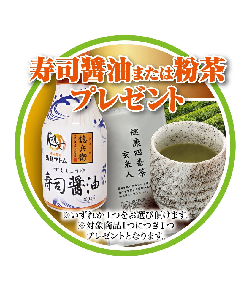 事前予約いただくと『寿司醤油』 または『粉茶(健康四番茶玄米入り)』をいずれかプレゼントいたします。