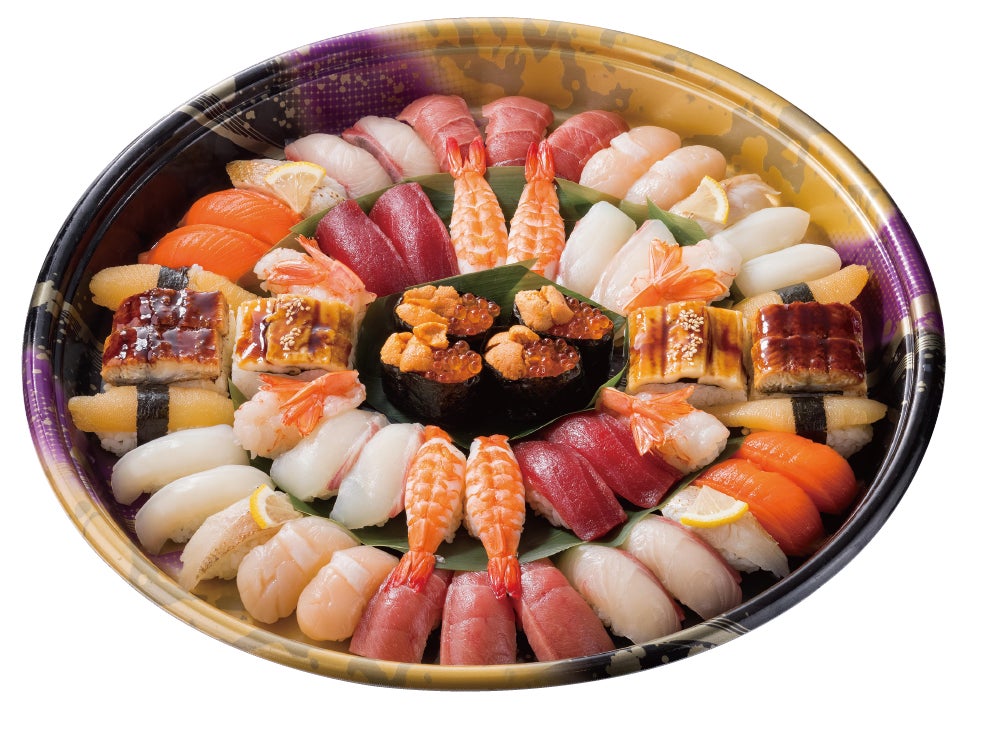 <いか・まぐろ・数の子・サーモン・のどぐろ・ぼたんえび・真鯛・かんぱち・本ずわい蟹・中とろ・うにいくら・うなぎ・飾り玉子>