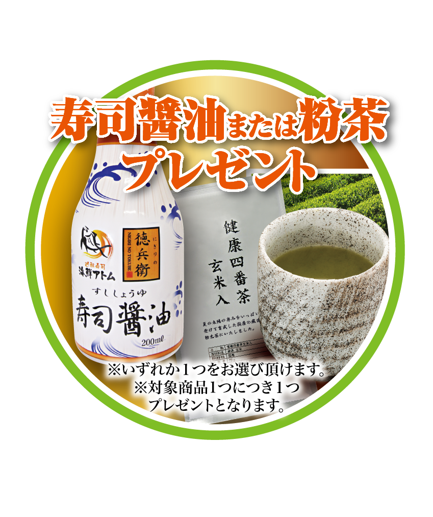 事前予約いただくと『寿司醤油』 または『粉茶(健康四番茶玄米入り)』をいずれかプレゼントいたします。