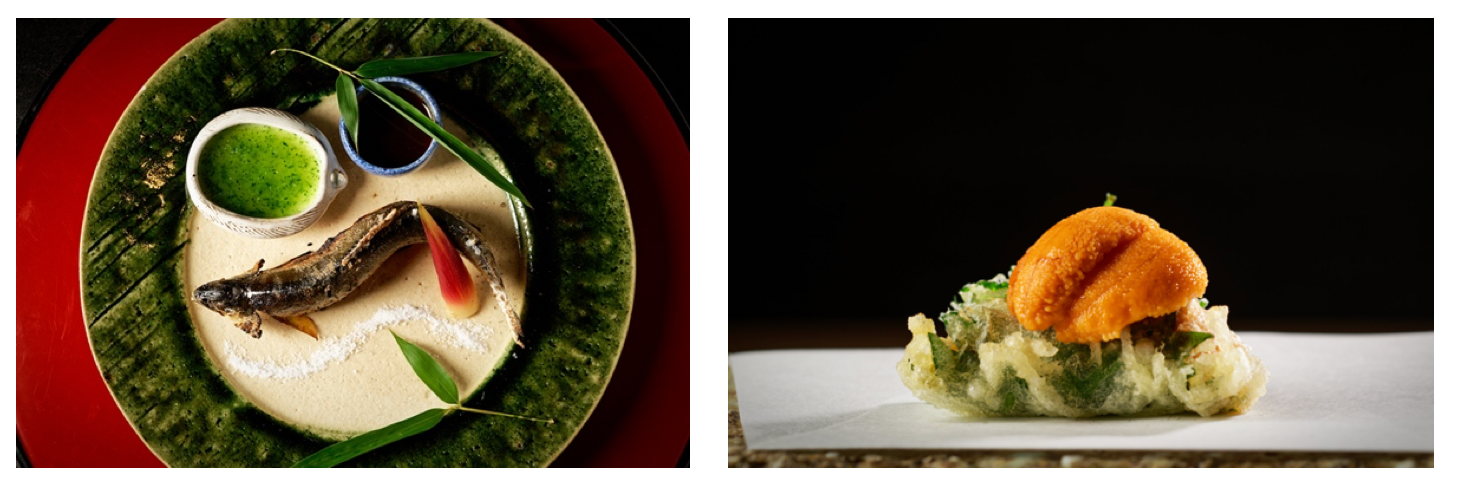 ❺焼物「鮎炉端焼き」、「鴨味噌麹幽庵焼き」 ❻凌ぎ「炭炙り〆鯖棒鮨」 ❼揚物「雲丹大葉天麩羅」