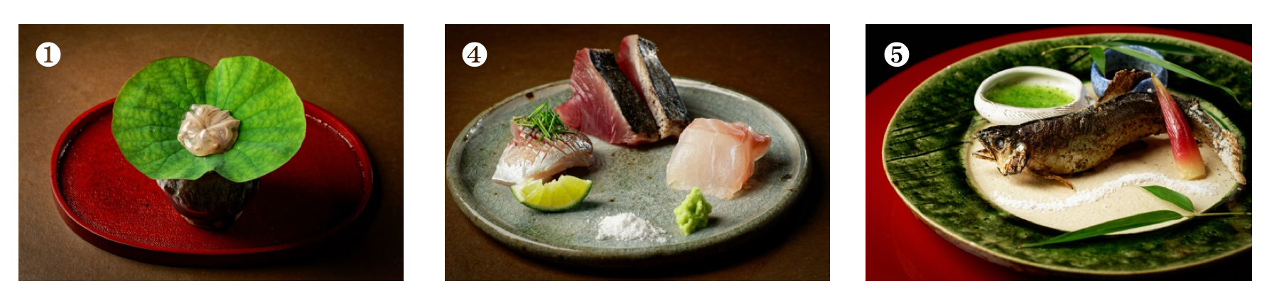 ❶先付「アメーラトマト冷やし鉢」 ❷椀物「毛蟹真薯」 ❸八寸「拾参の彩り」 ❹造里「鮮魚のお造り」