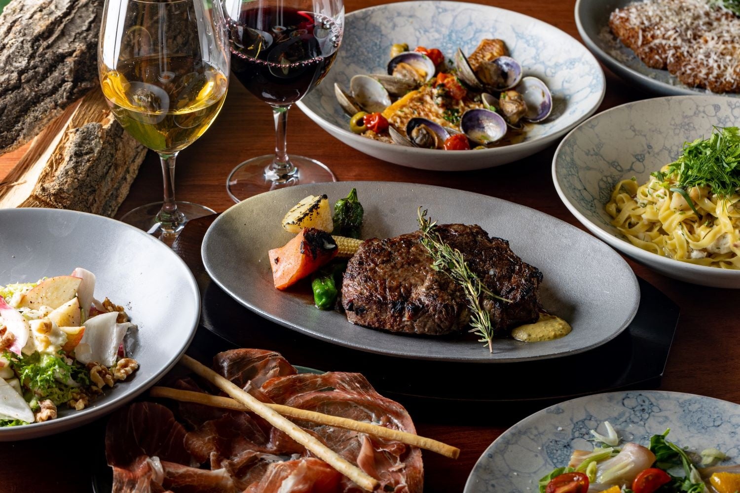 メインディッシュには豪快に薪火で仕上げたお肉料理を!和牛と同じ穀物飼育で200日以上かけて育てられたアンガス牛の旨味抜群の薪焼きステーキは、是非召し上がって頂きたい一皿。薪火の高い熱量と薪から蒸発した水分により、外はカリッと香ばしく、中は旨味をたっぷりと含んだままジューシーに仕上がります。その他にも、黒毛和牛ハラミステーキや白金豚、日替わり鮮魚の薪焼きもご用意しています。