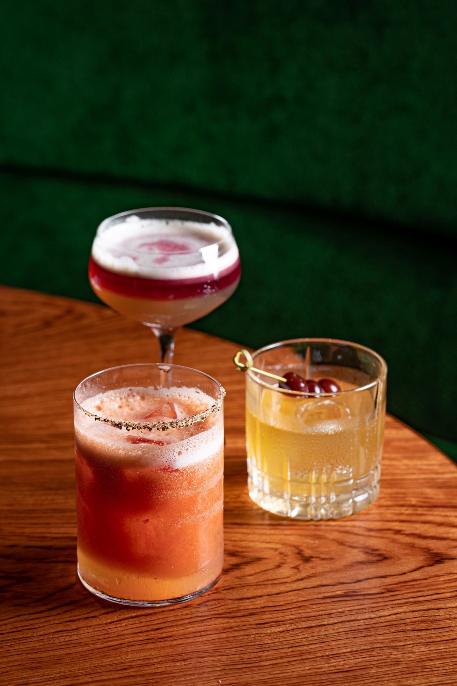 ウィスキーサワーにイタリアの赤ワインをフローとさせた、ニューヨーク・サワー(1,210円 税込/写真左奥)