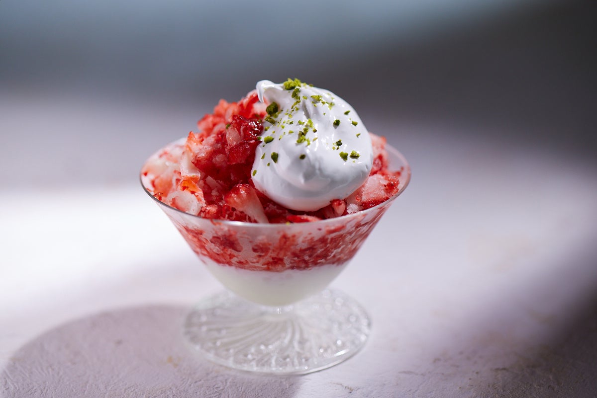 急速冷凍した”岐阜県産いちご”を丸ごと削り出し、awaはちみつを贅沢にトッピング。中層には甘さ控えめなawaはちみつヨーグルトソースを閉じ込めました。甘酸っぱいいちごに優しいヨーグルトの酸味。そこにawaはちみつのふんわり優しい甘さが交互に混ざり合い、暑い夏にぴったりの爽やかデザートです。