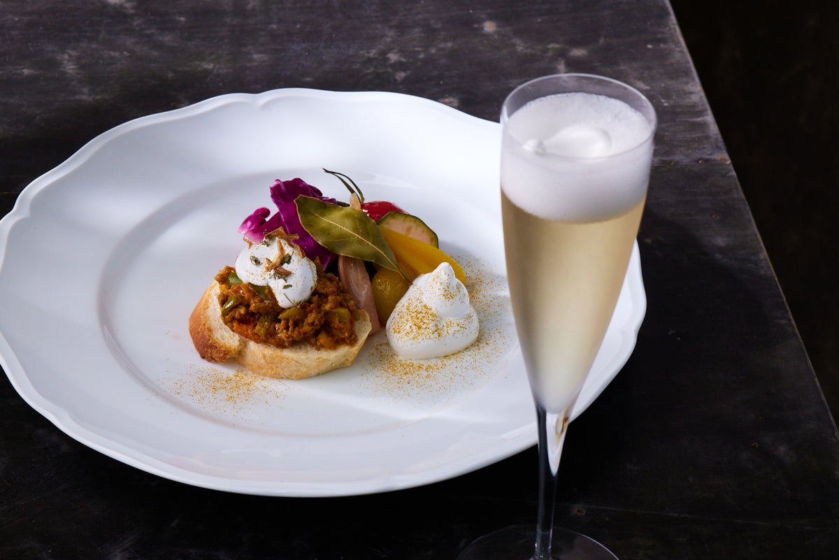 シャンパンにawaはちみつを加えると…激しく発泡する様子は圧巻。シャンパンと一緒に、awaはちみつとの相性抜群のキーマカレーバゲットとピクルスのセットを別添えでご用意しております。