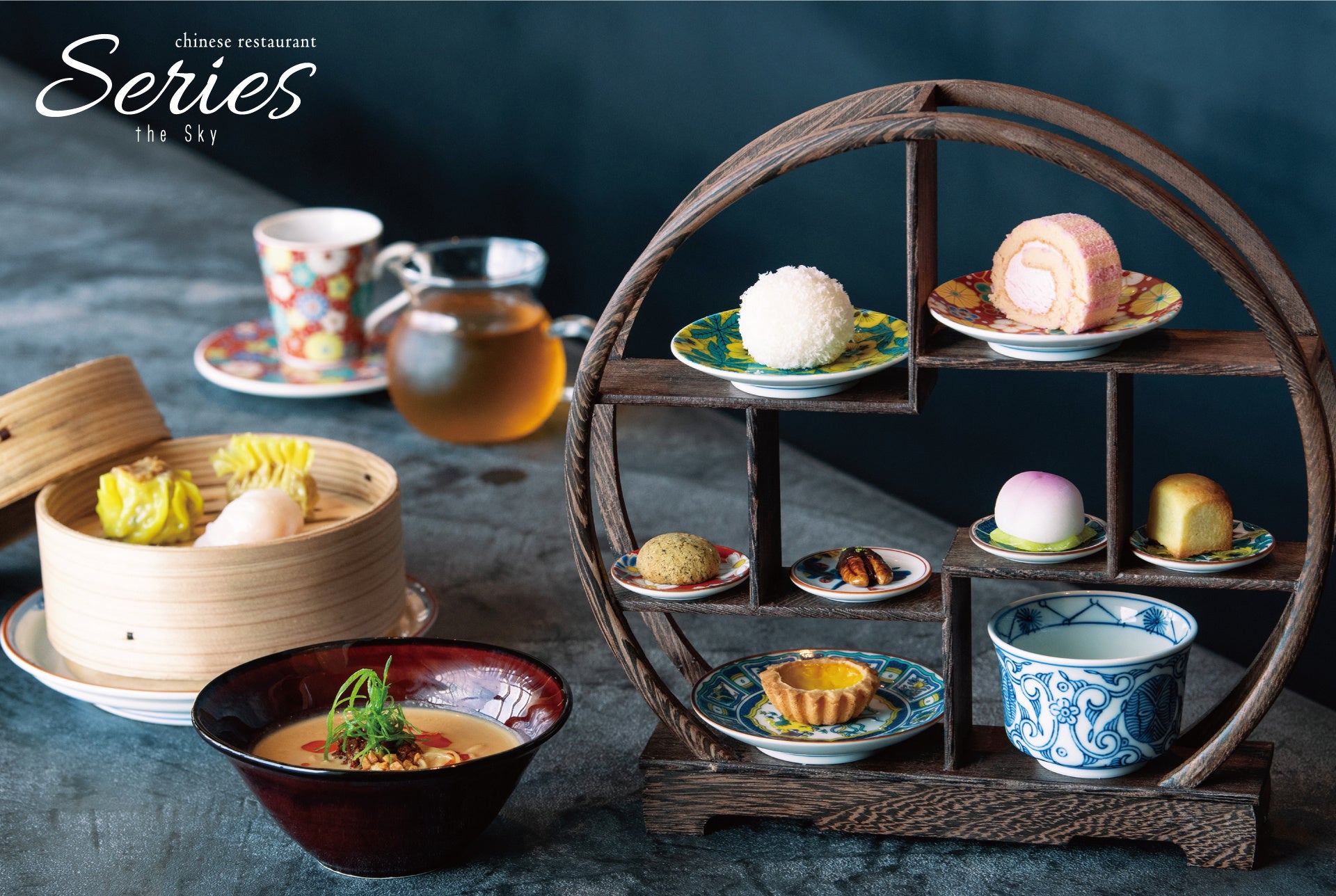 東京ソラマチ31階にある中華レストラン「Series the Sky」(シリーズザスカイ)では、15:00~17:00はアフタヌーンティータイムとなります。この時間に注文可能なアフタヌーンティーは、特製の蒸し点心3種・担々麺・お茶菓子7種・杏仁豆腐に加え選べる中国茶がついたセットとなっており、「Series the Sky」限定のメニューです。