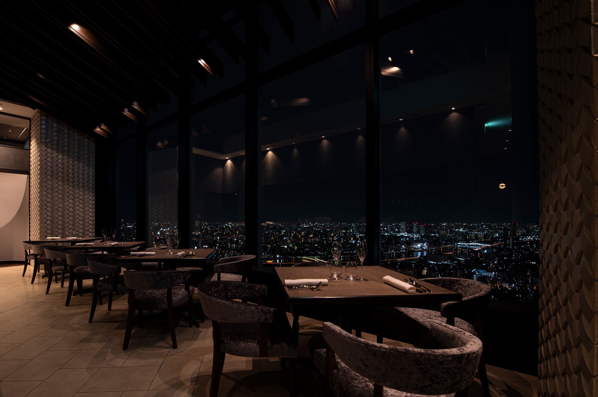 店内は72席の客席がある広々とした空間で、高さ150mという非日常空間で都心のパノラミックな眺望をお楽しみいただけます。高級感あふれるシックな色調に、各所に散りばめられた古伊万里などの調度品が交わるラグジュアリーな雰囲気は、誕生日や記念日などの特別な日にピッタリ。アニバーサリープランなどもご用意しておりますので、お祝いムードも演出できます。さらに、プライベートを重視する方には2名から8名まで使用可能な個室もございます。