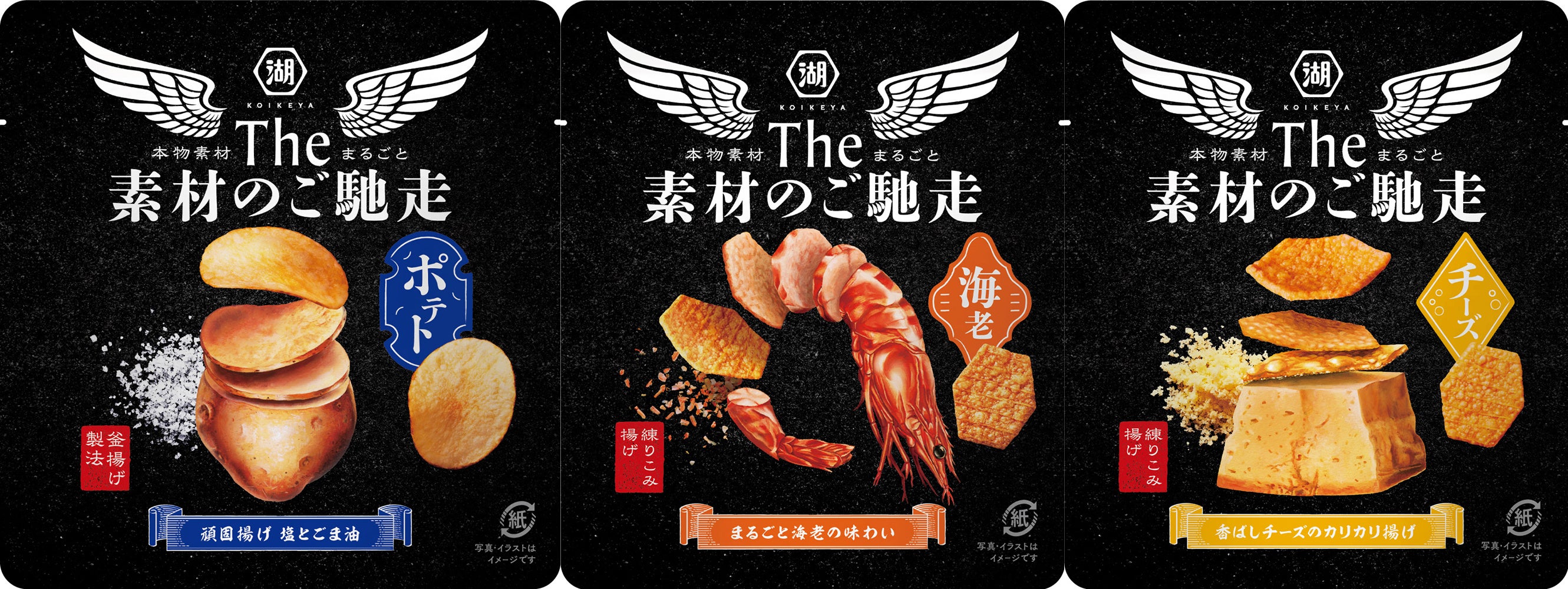 「The 素材のご馳走」は、現行の「The KOIKEYA」でご評価いただいている“珍味のような素材感”というハードの強みを活かし、ポテト/海老/チーズの3品ともに“素材の旨み”が存分に堪能できる味わいに仕上げています。パッケージでも、黒をベースとして高級感・上質感を演出しつつ、素材からチップスに変化している特徴的なデザインを中央に配置し、“素材の旨み”がそのままチップスに詰まっていることを表現しています。さらに、「紙」を使ったパッケージを使用することで、品質感を加えるとともに、プラスチック削減を目指した環境配慮型の商品にもなっています。