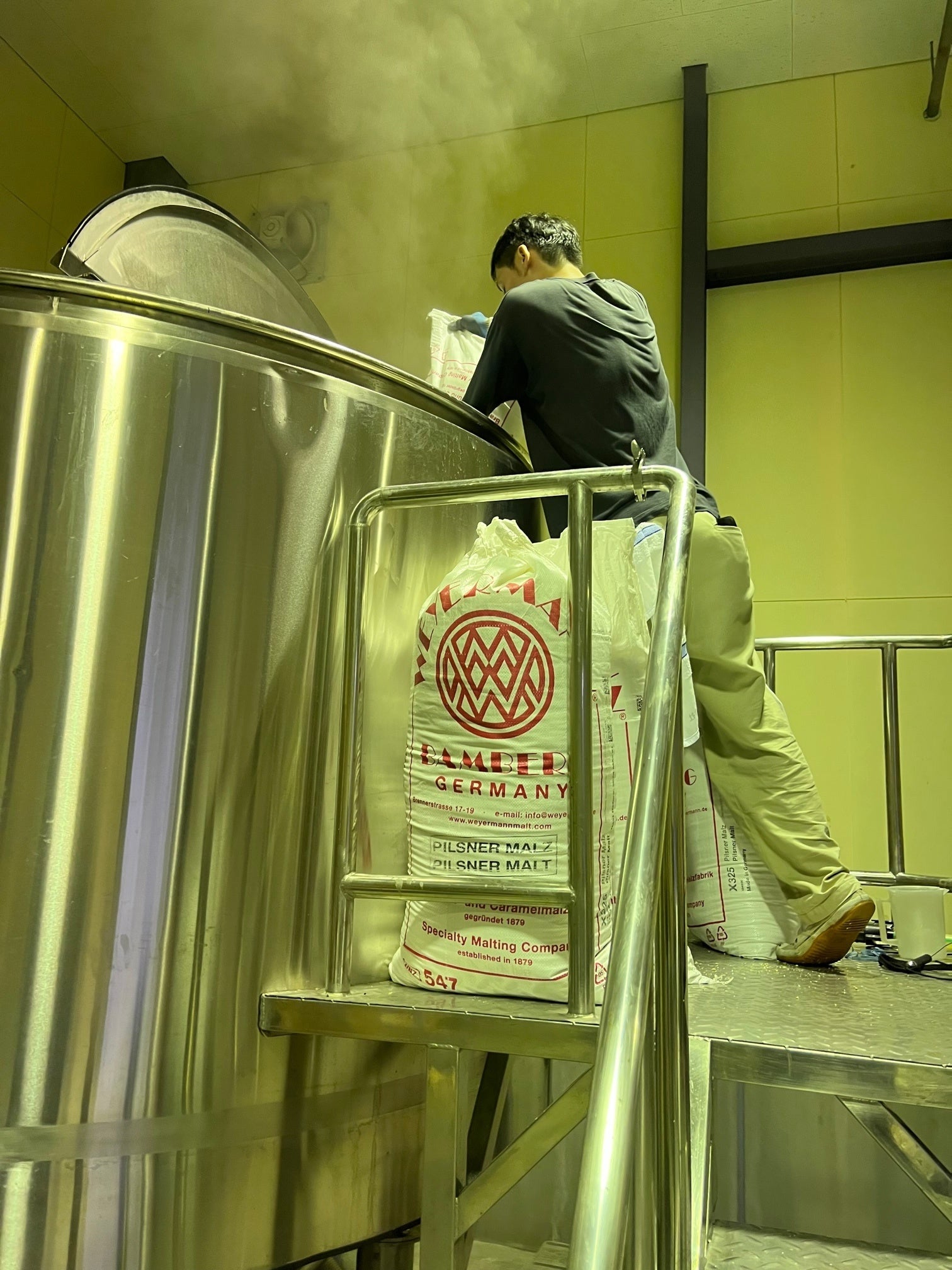 糖化-大麦麦芽に温度60度以上のお湯を加えて麦汁を作ります。発芽した大麦の酵素がでんぷん質を分解して糖を作り、麦汁となります。マッシュタン(糖化槽)の中で麦汁を循環させることにより透明度の高い麦汁になっていきます。