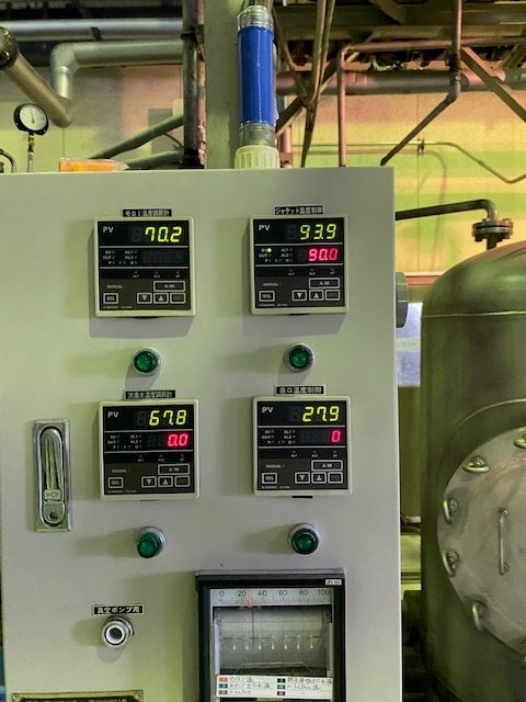 蒸留-蒸気の量を調整することでもろみの温度を管理しながら慎重に蒸留を行いました。通常アルコール度数7-9%程度のもろみを2回蒸留させることで60度以上のウイスキー原酒となります。2回目の蒸留(再留)の際に、蒸留初期に流出する「前留(ヘッド)」と蒸留終期の「後留(テイル)」を除去するミドルカットという作業を行います。横川蒸留所ではミドルカットの量を狭く取ることで優しく飲み易い味わいの原酒づくりを目指しています。