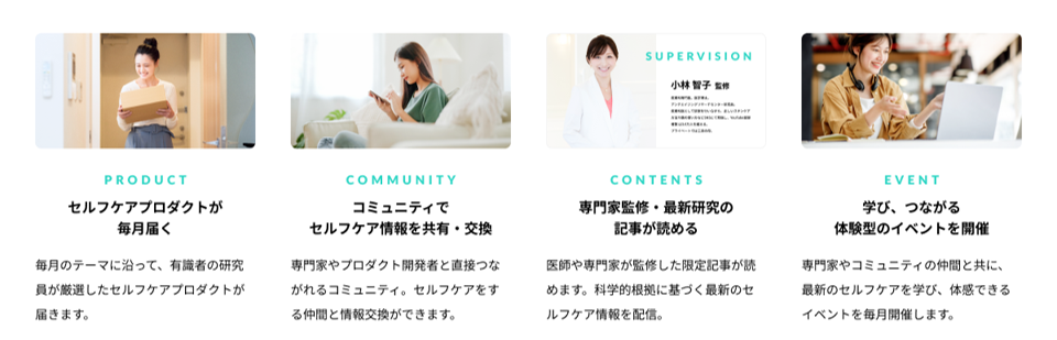 特長:毎月のセルフケアテーマに沿ったプロダクトが届き、セルフケアの情報・つながりが得られる