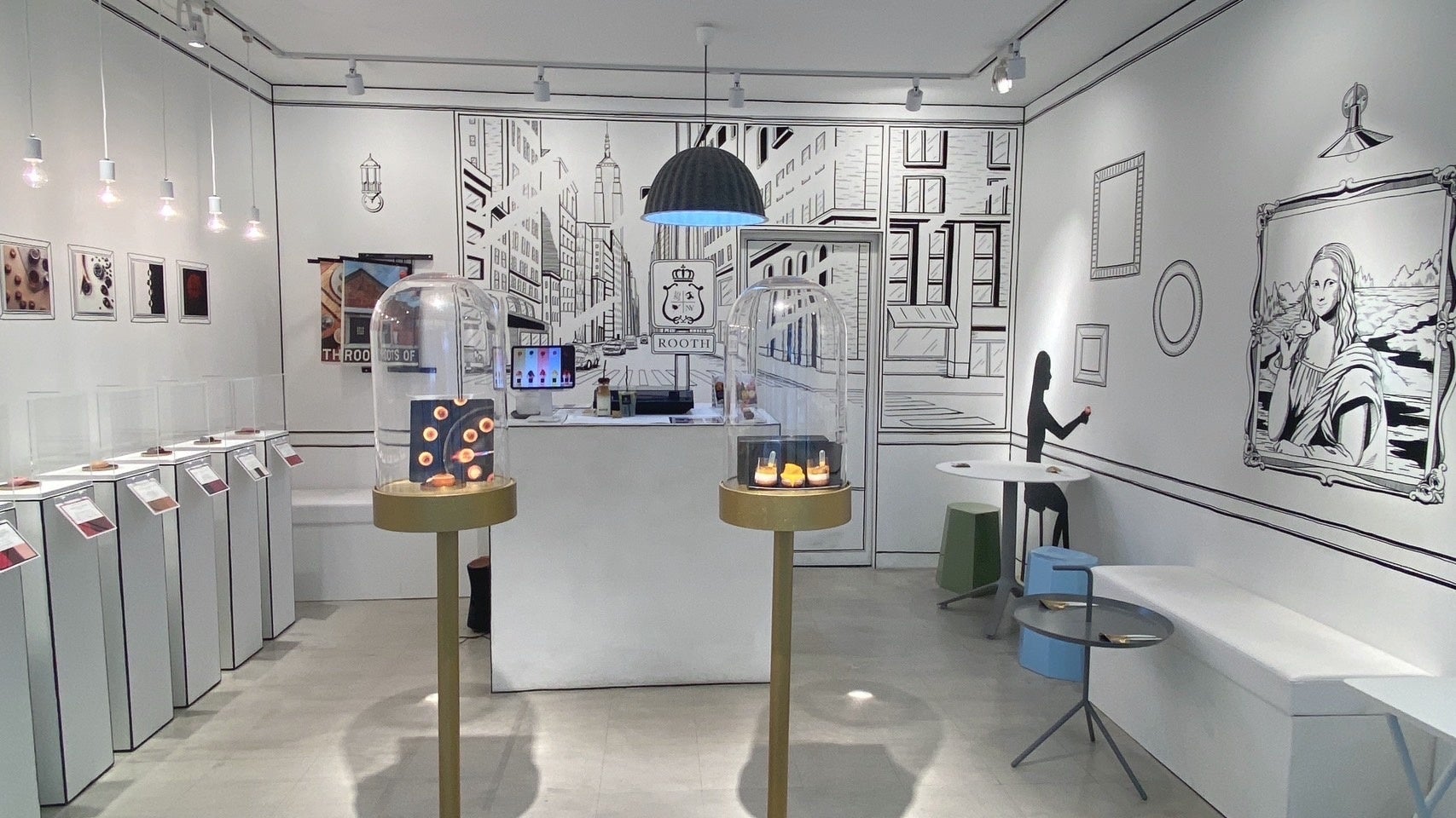ROOTH FUKUOKAはドーナツを商品としてではなく、作品としてディスプレイ。ドーナツワーカーが毎朝揚げ、こだわりの手作りソースをひとつひとつ色や香りを確かめながら丁寧に仕上げていくさまは、まさに作品そのもの。今回、2Dドーナツ美術館にすることにより、これまで以上にたくさんの方にドーナツを楽しんでいただくためにNYの街並みや美術作品とドーナツのコラボレーションなどを店内で表現しています。