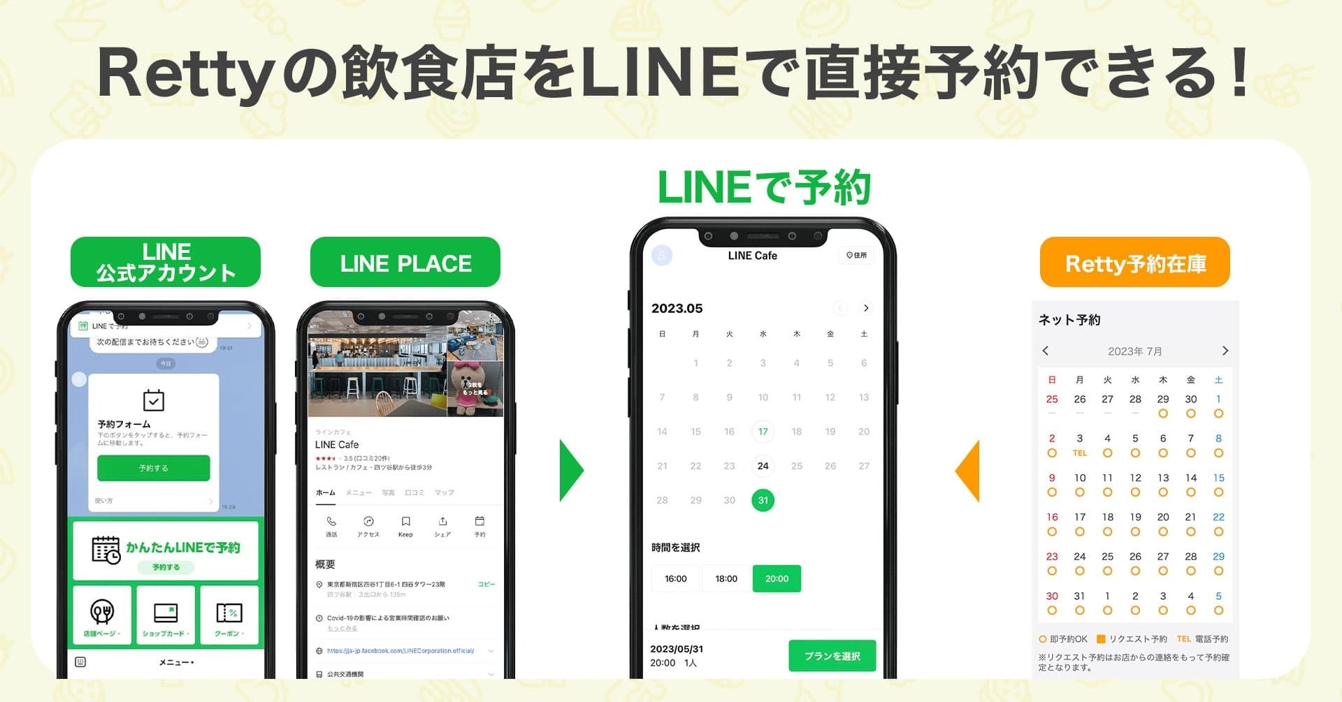 Rettyは飲食店の席在庫情報を「LINEで予約」に提供します。これにより、ユーザーはLINE上の店舗情報ページやお店のLINE公式アカウント(※1)から、アプリ外へ遷移することなく予約を完結できるようになります。