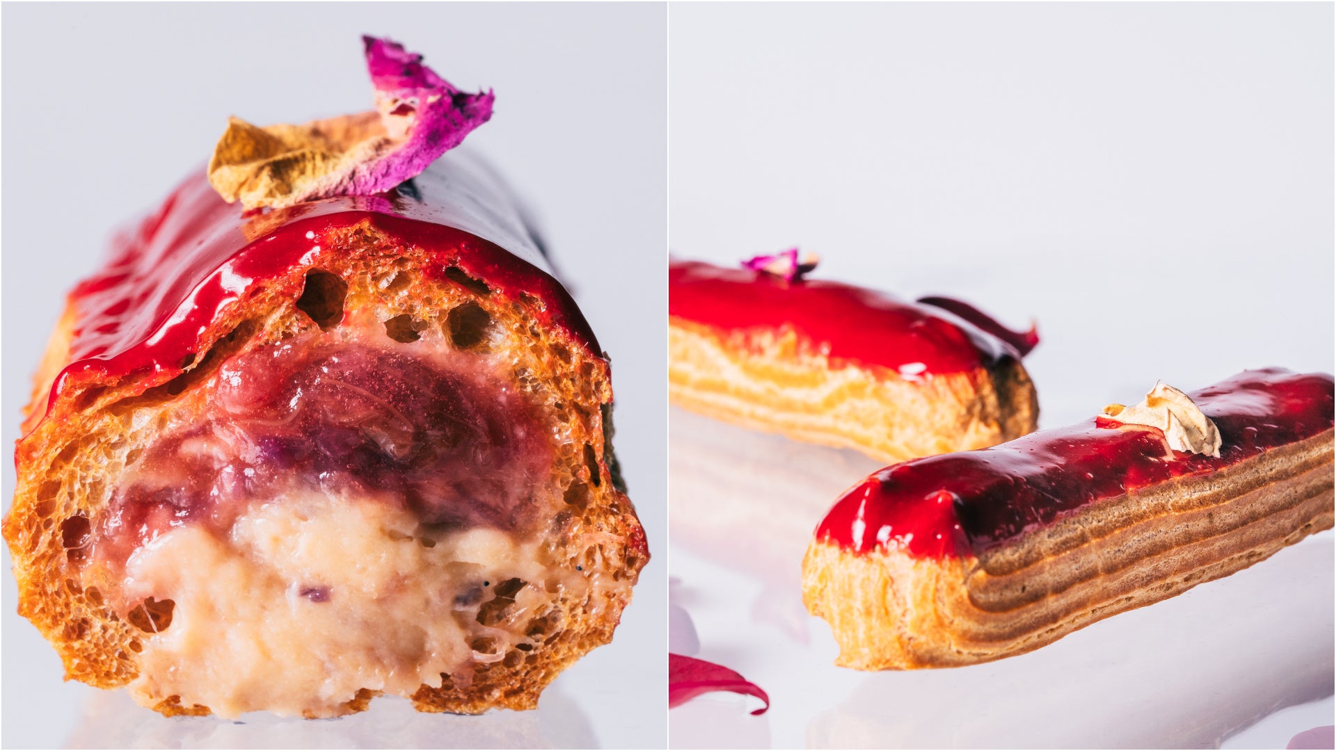 『バラのジャム spécialité 』と『木苺と赤スグリのピューレ』、『カスタードクリーム』をたっぷり詰め込んだバラのエクレア。木苺が持つ甘酸っぱさ、赤スグリの酸味とわずかな青臭さがバラの香りと相性が抜群。バラの味わいや香りの輪郭をはっきりさせ、味の奥行きと華やかさが広がります。気鋭の若手、カルペディエムの河村シェフとのコラボレーションです。