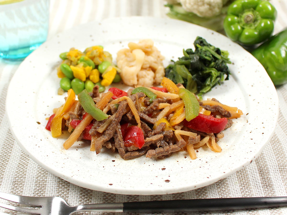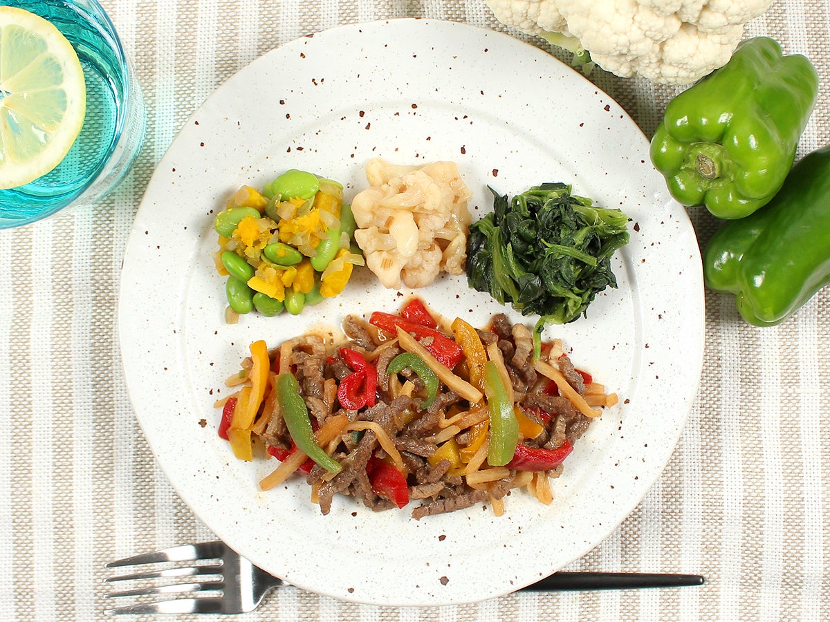 中華料理の定番であるチンジャオロースを赤、緑、黄色の三色のピーマンで仕上げました。醤油ベースの鶏ガラスープに、オイスターソースと黒胡椒をアクセントに加えました。牛モモ肉の食感と、ピーマン、タケノコのシャキシャキ感をお楽しみいただけるプレートとなっておりますので、よく混ぜてお召し上がりください。