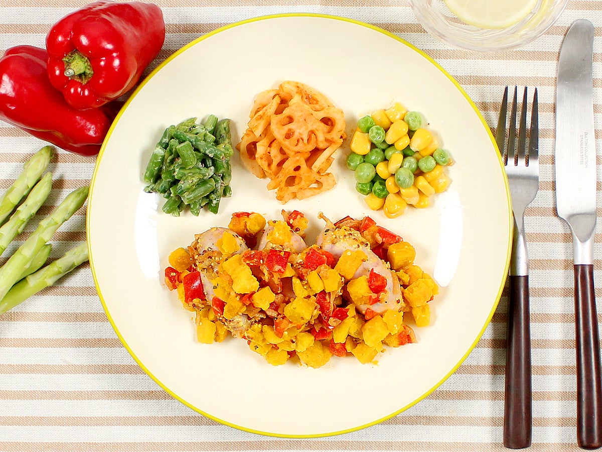 副菜は、ブラックペッパーが効いたアスパラのチーズソース、スパイシーなレンコンカレー、コンソメ風味のコーンとグリンピースのサラダです。