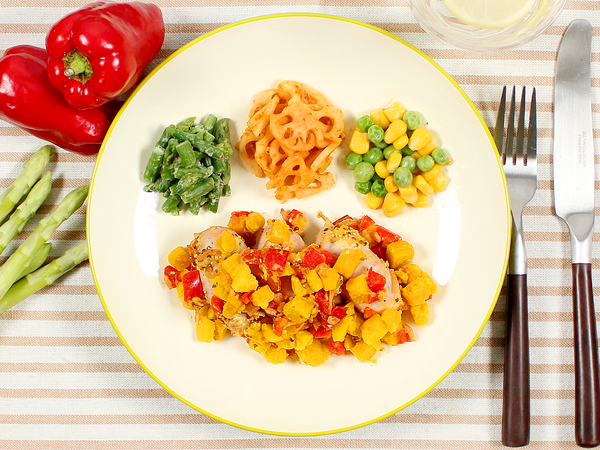 副菜は、ブラックペッパーが効いたアスパラのチーズソース、スパイシーなレンコンカレー、コンソメ風味のコーンとグリンピースのサラダです。