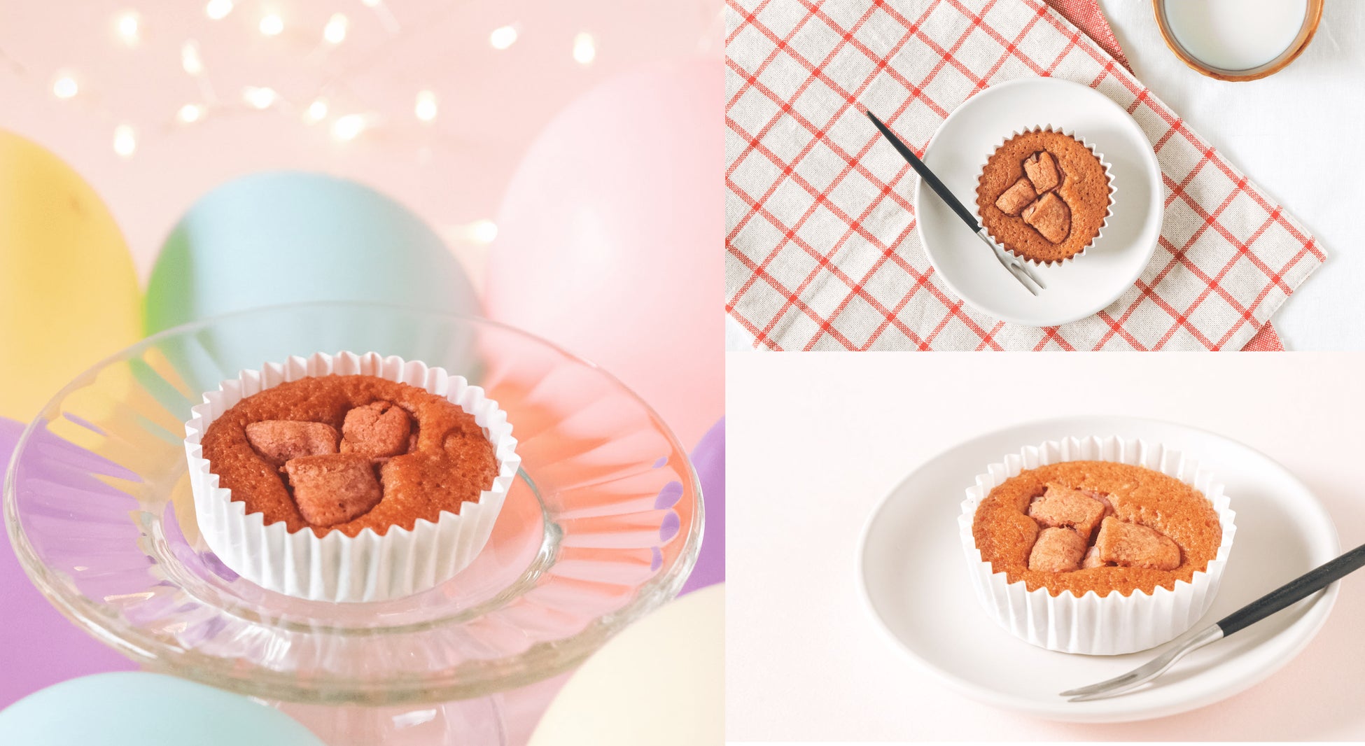 香り高いストロベリーピューレとこく深い粗糖製ホワイトチョコを使って、ショートケーキ風味のカップケーキを作りました。ミルクといちごのやさしいおいしさがふんわり広がります。