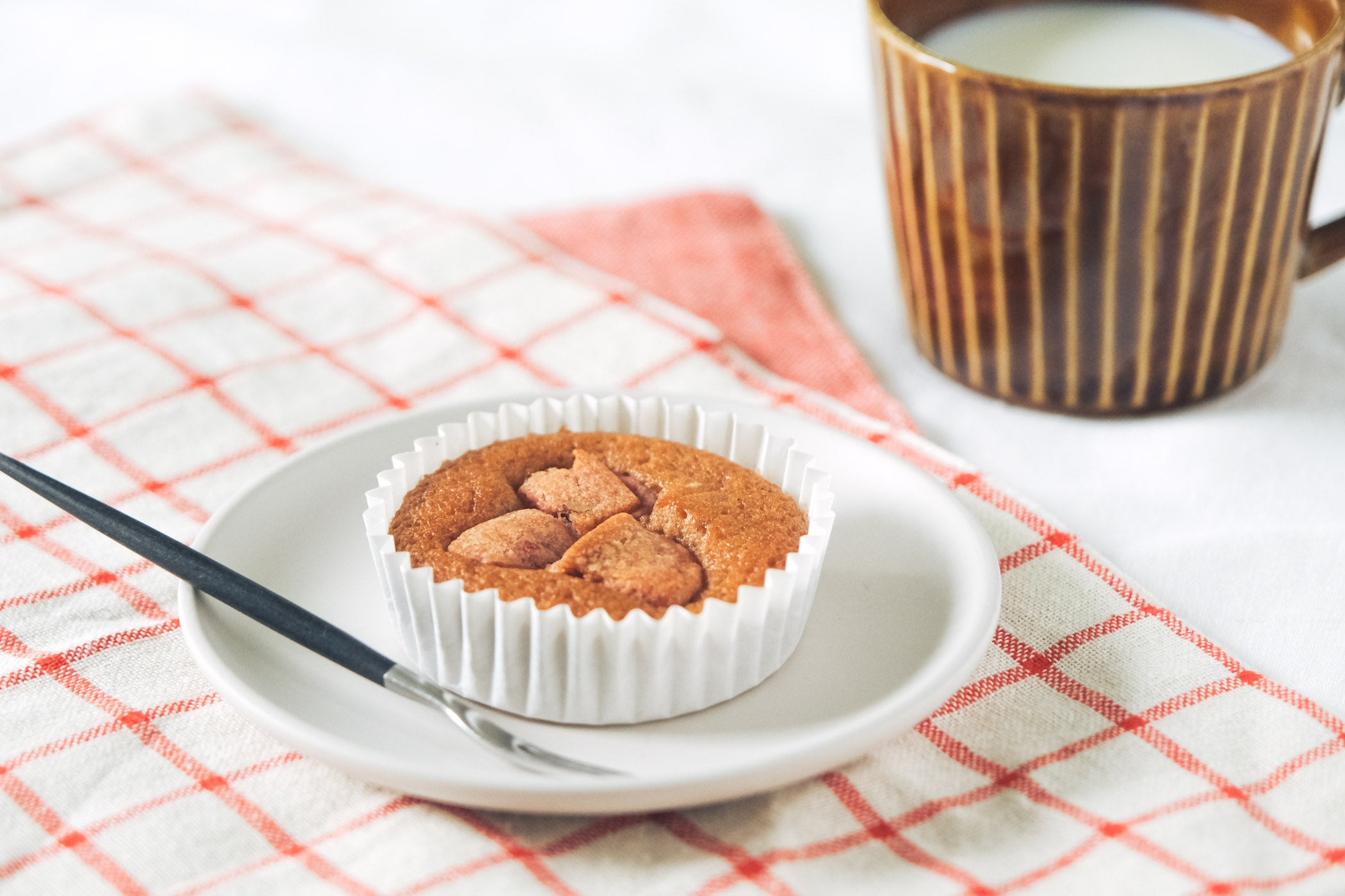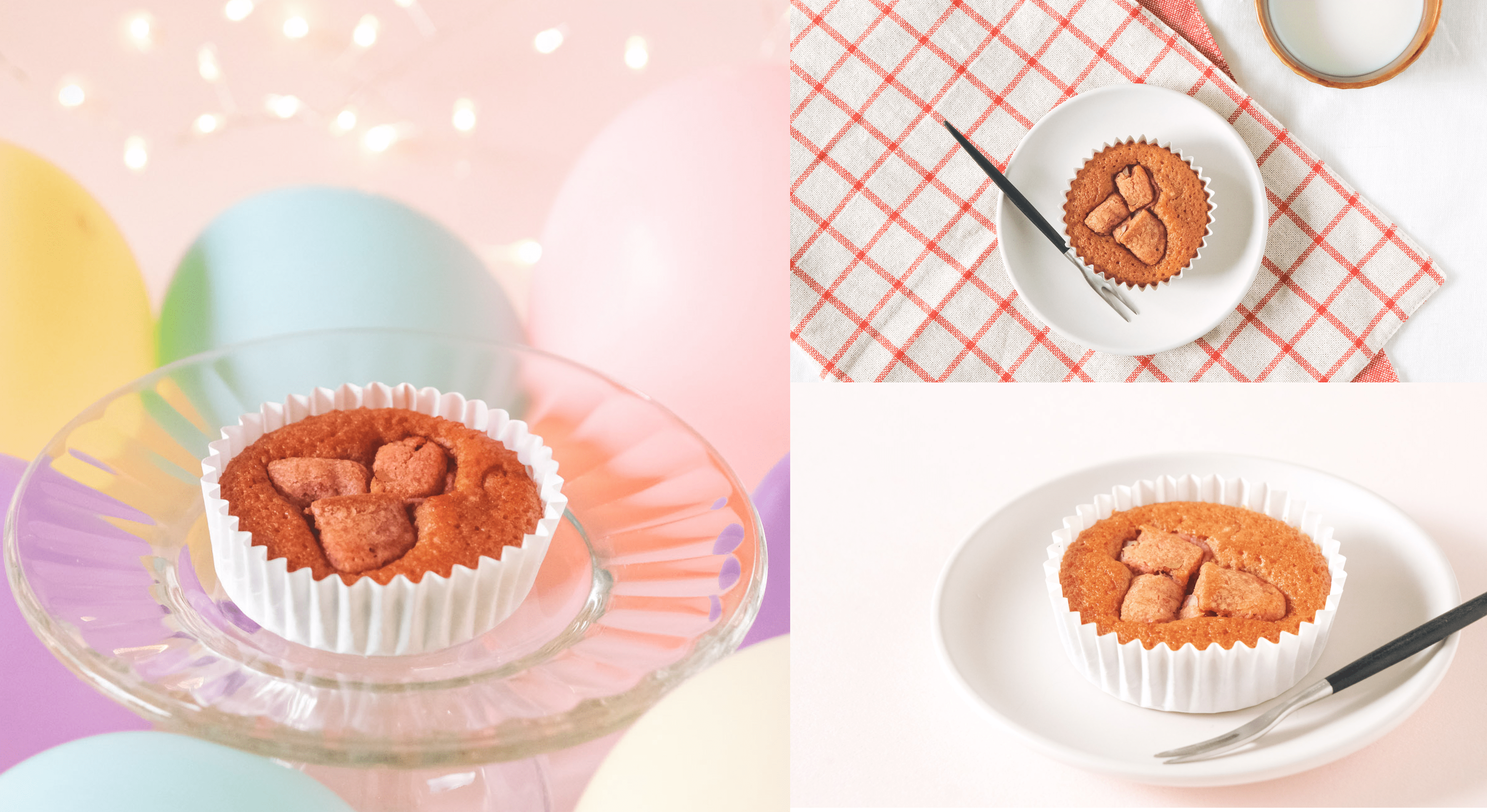 香り高いストロベリーピューレとこく深い粗糖製ホワイトチョコを使って、ショートケーキ風味のカップケーキを作りました。ミルクといちごのやさしいおいしさがふんわり広がります。