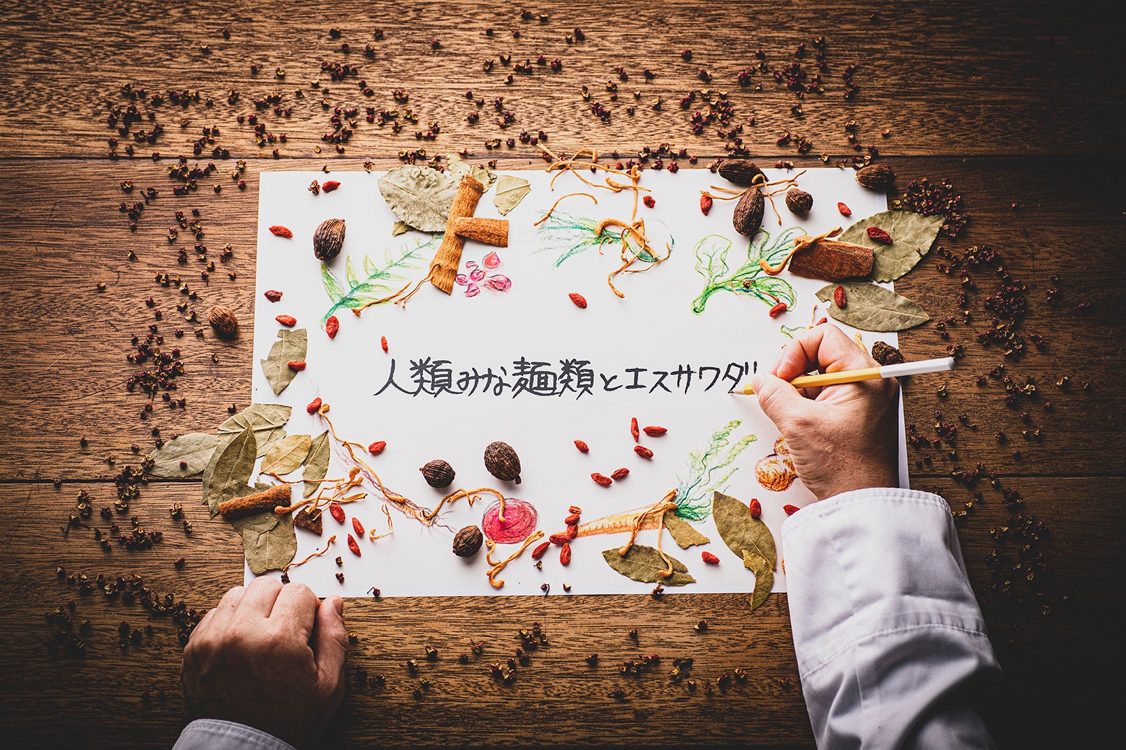 「人類みな麺類とエスサワダ」で提供するラーメンは、大阪行列No.1ラーメン店「人類みな麺類」の醤油ラーメンをベースに、澤田シェフが独自のスパイスを調合したこれまでに無い新感覚の「薬膳ラーメン」を提供いたします。使用するラーメン鉢もこだわり、陶芸家 玉山弘季(陶芸工房 Tama atelier 代表)が作り上げました。テーマは”バキバキ”で、破壊と想像を繰り返し薬膳ラーメンとの調和を目指した究極の陶器です。