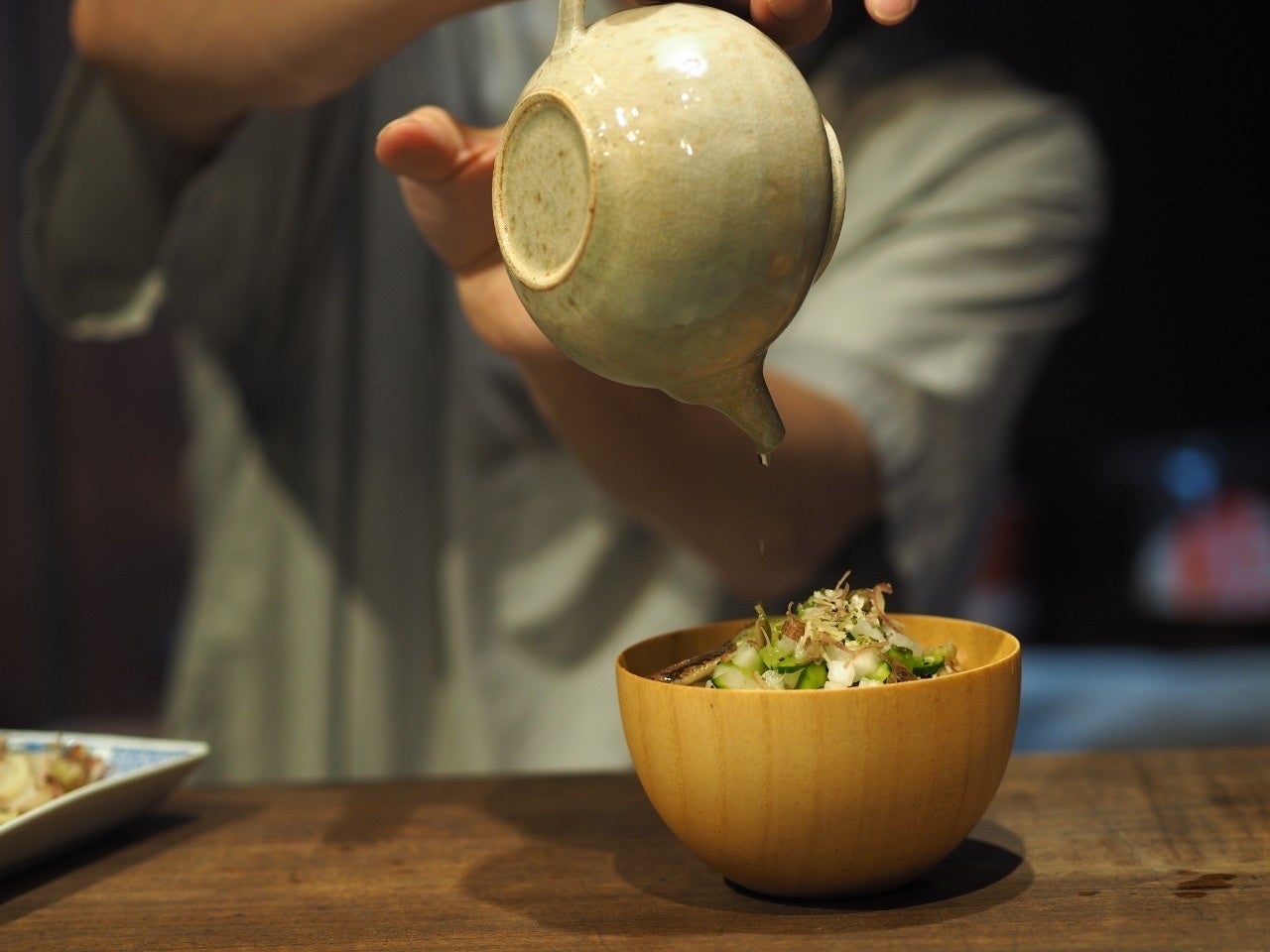 美しい水色、豊かな香り、そして深く感じられる土地のテロワールに五感を研ぎ澄ませる。一口で、普段何気なく口にしてきたお茶のイメージが鮮やかに覆され、店主・河野知基の語りは一杯のお茶の奥に広がる景色を感じさせてくれます。また、お茶から導かれる組み合わせの妙は、日々の食事シーンでのお茶の味わい方を大きく変えてくれるはずです。