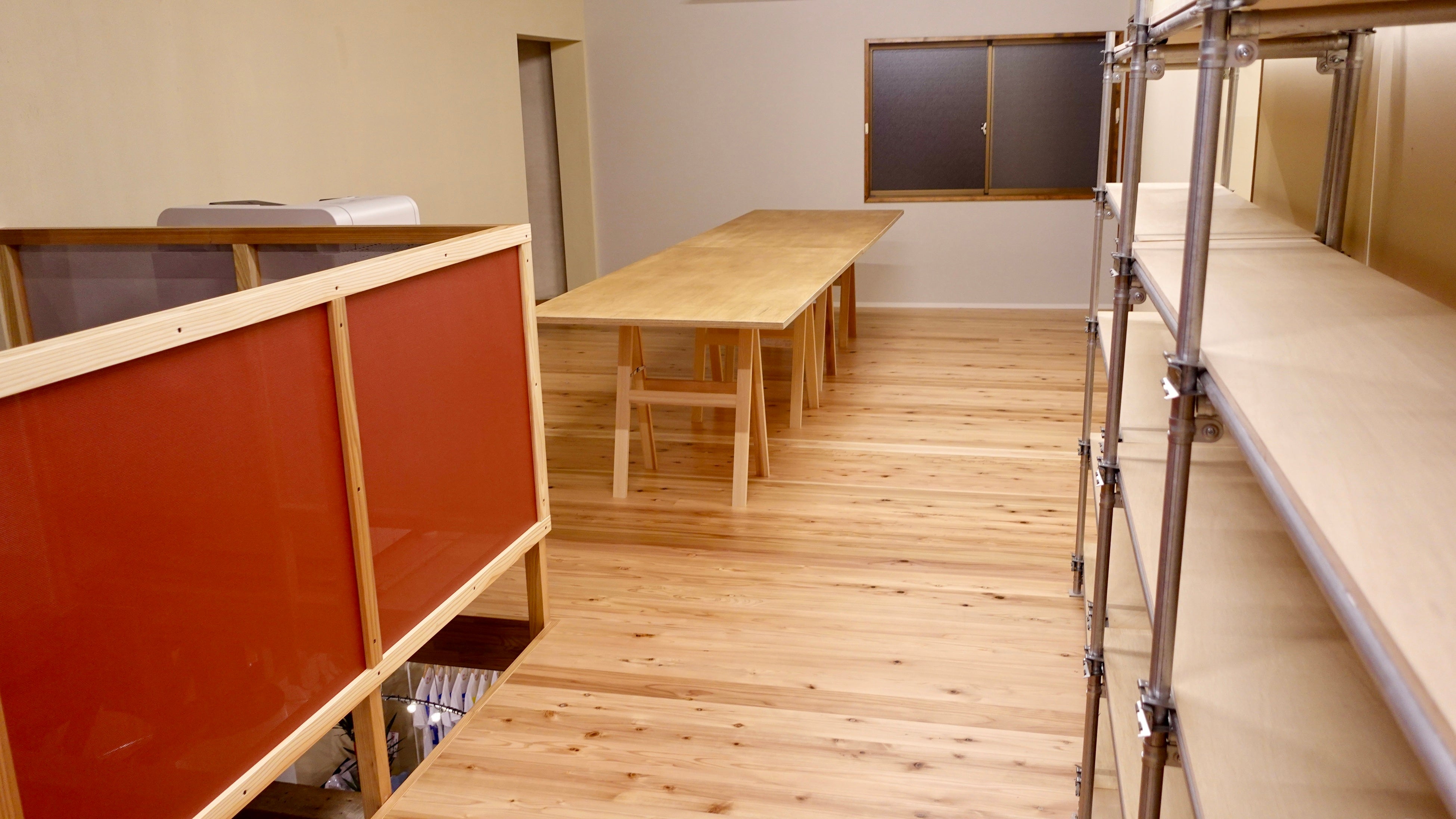 下の写真はワークショップの活用を想定した長テーブルと本棚、複合機です。