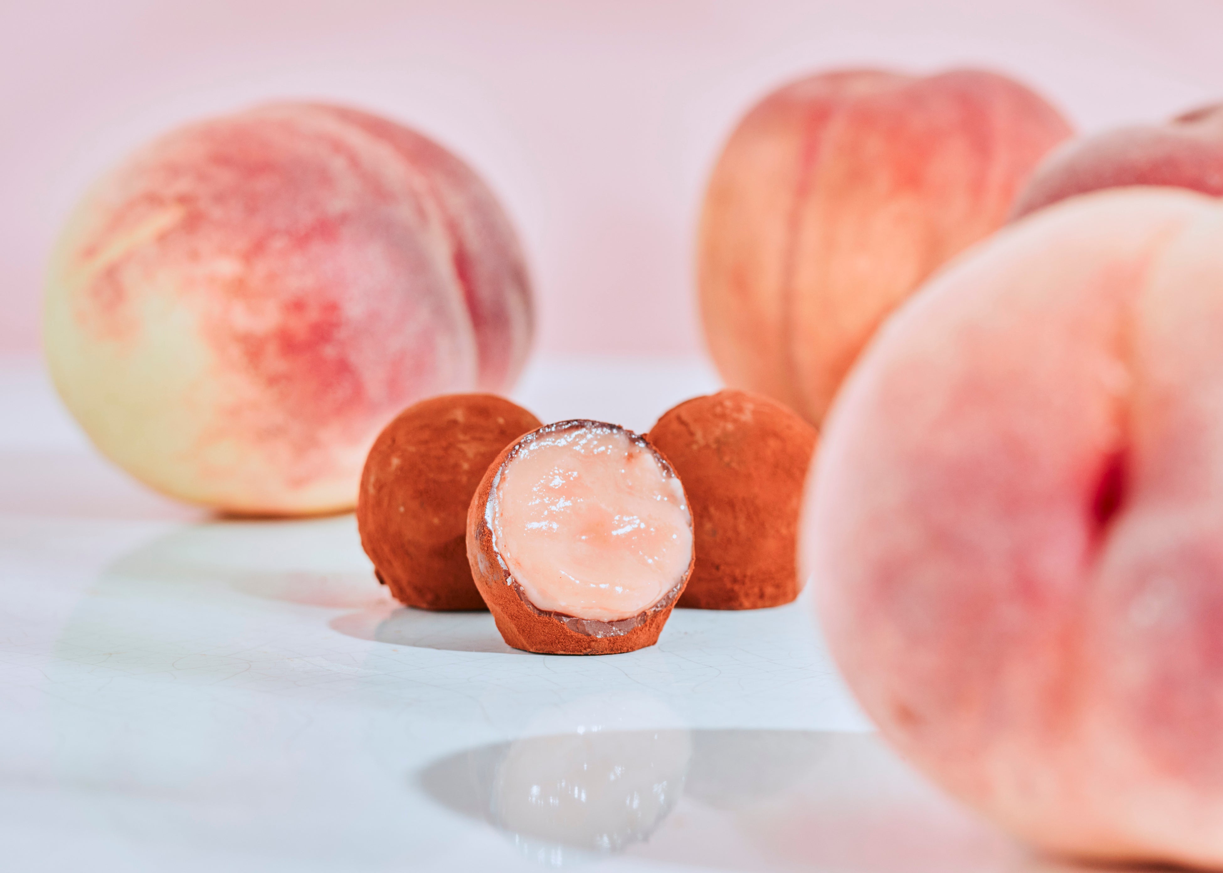 メゾンカカオの看板品「アロマ生トリュフ」は、パリッと薄いコーティングの中からなめらかなガナッシュが流れ出る、究極の口溶けにこだわった一品です。夏限定フレーバーとして、笠井農園の白桃を使用した味わいが登場します。酸味は少なく糖度の高い爽やかな味わいを持つ白桃のピューレとホワイトチョコレートを合わせた瑞々しいショコラがとろけ出します。