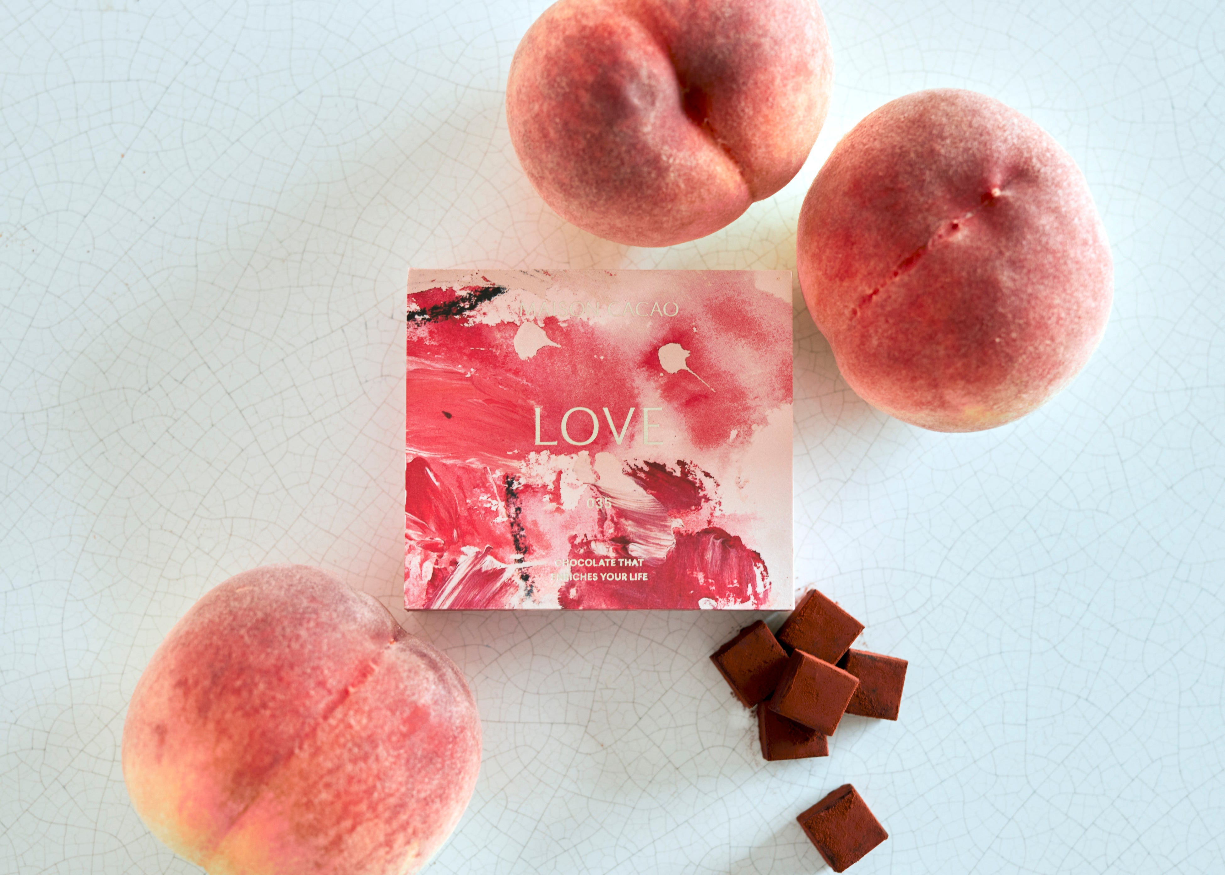 代表の石原が日本各地を旅して出会った生産者の素材へのこだわりを聞き、その美味しさを最大限に引き出すチョコレートを作り、旬の味わいとして提案しています。7-8月は山梨県山梨市、桃の名産地の中でもひときわ手間暇をかけて育てられた笠井農園の白桃が登場。