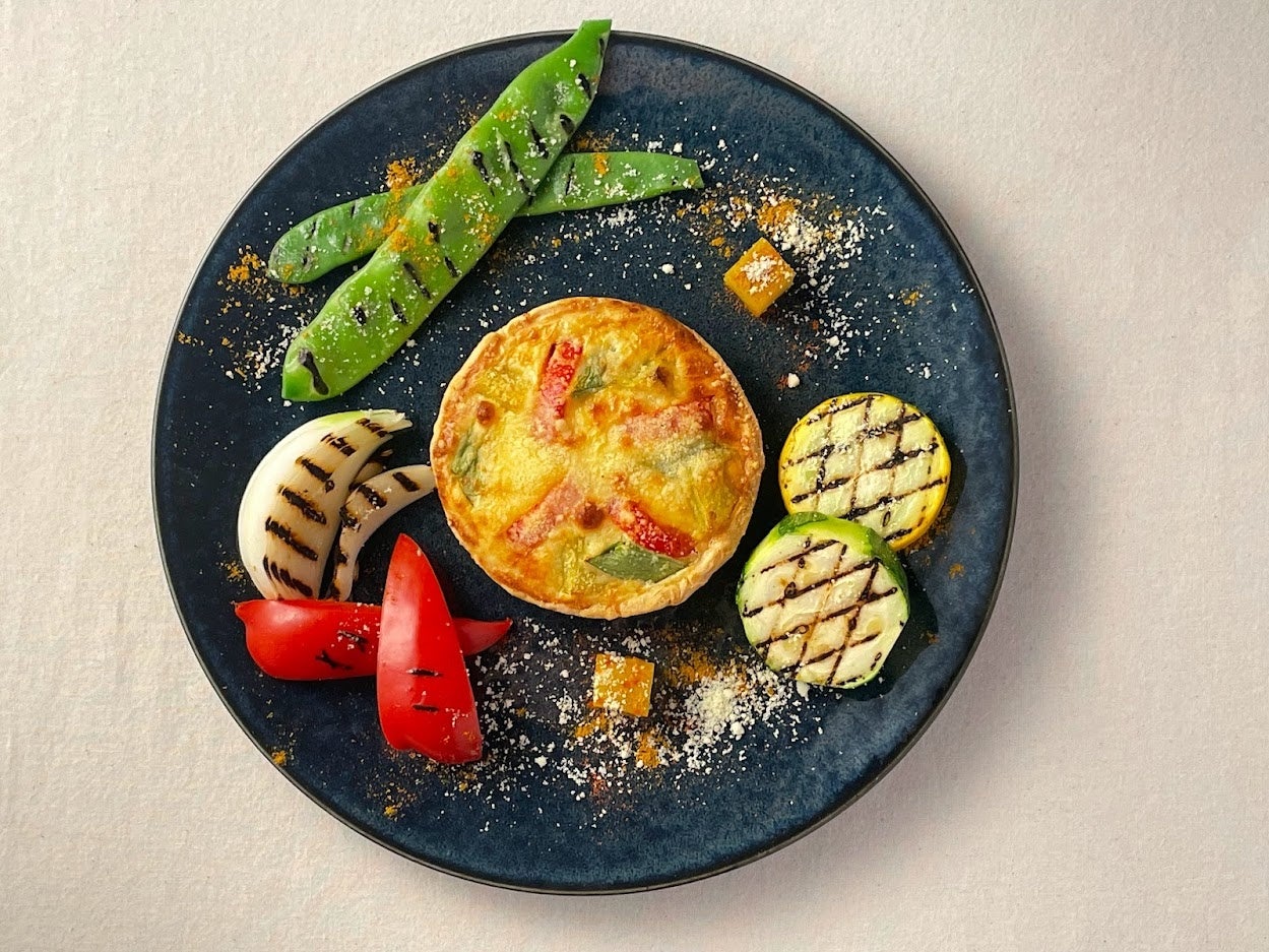 フランス産豚バラ肉のサイコロソテーと、たっぷり香味野菜と牛肉を使い、赤ワインも加えて煮込んだレストラン仕立てのキーマカレーに兵庫県産の採れたて夏野菜をトッピングした夏らしいキッシュです。