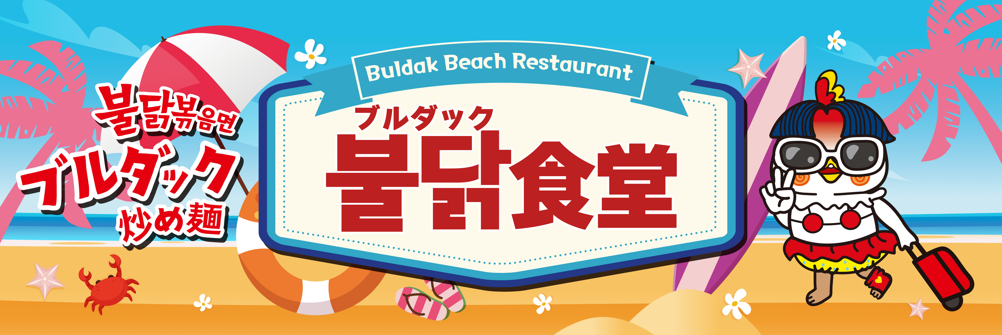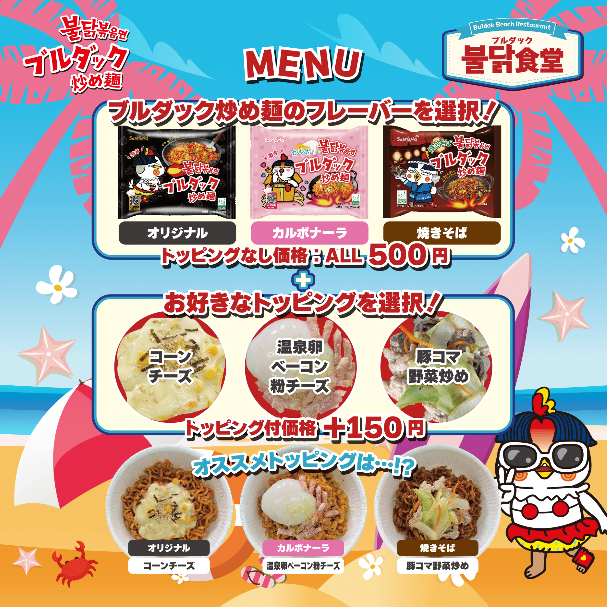 ブルダック食堂では、海の家の通常メニューはもちろんのこと、3種類のブルダック炒め麺×3種類のトッピングを自由に組み合わせて楽しむことが出来ます。