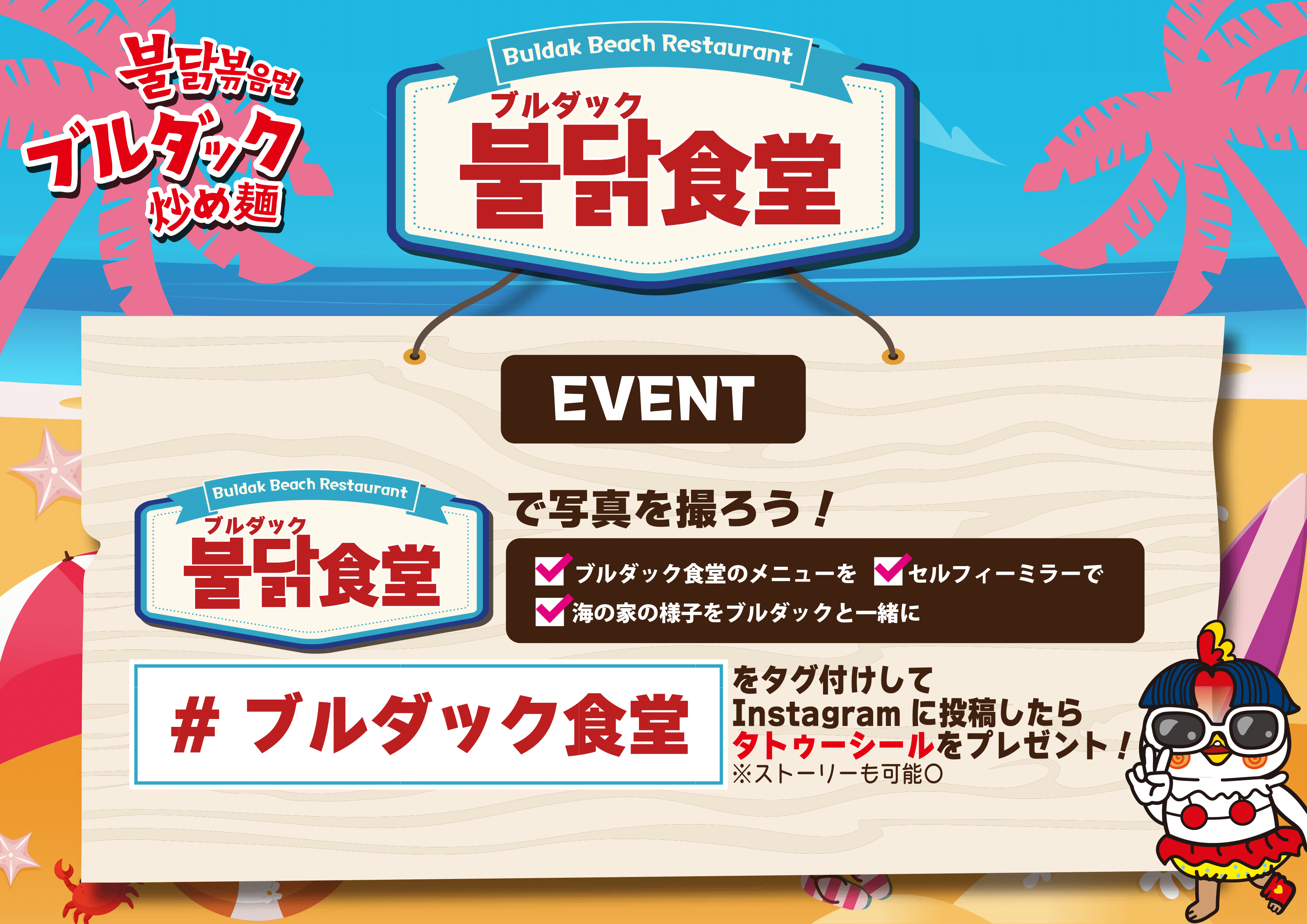 上記日程にて、#ブルダック食堂 をタグ付けしたInstagram投稿(フィード・ストーリー・リールが対象)をお見せいただくとその場で「ホチ」オリジナルタトゥーシールプレゼント!