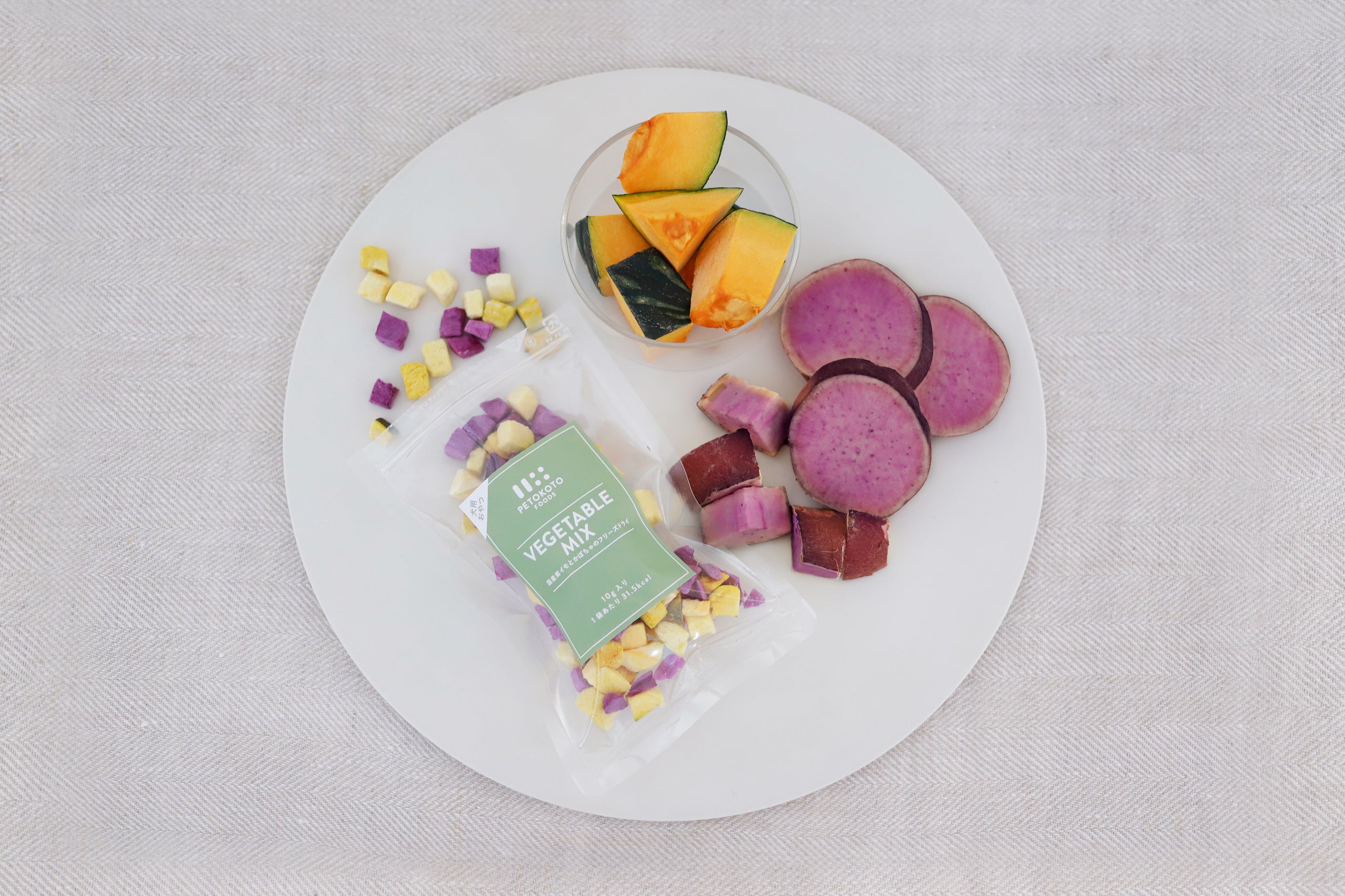 鹿児島産の紫いもと国産のかぼちゃの甘みとホクホク感を引き出すために、加熱してからフリーズドライにするひと手間を加えました。野菜を食べ慣れていない愛犬にもおすすめです。
