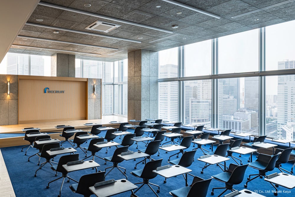 ▼【セミナールーム】ガラス張りで解放感のある空間。登壇者は、ステージの上を自由に歩きながら、参加者とコミュニケーションを取ることができます。