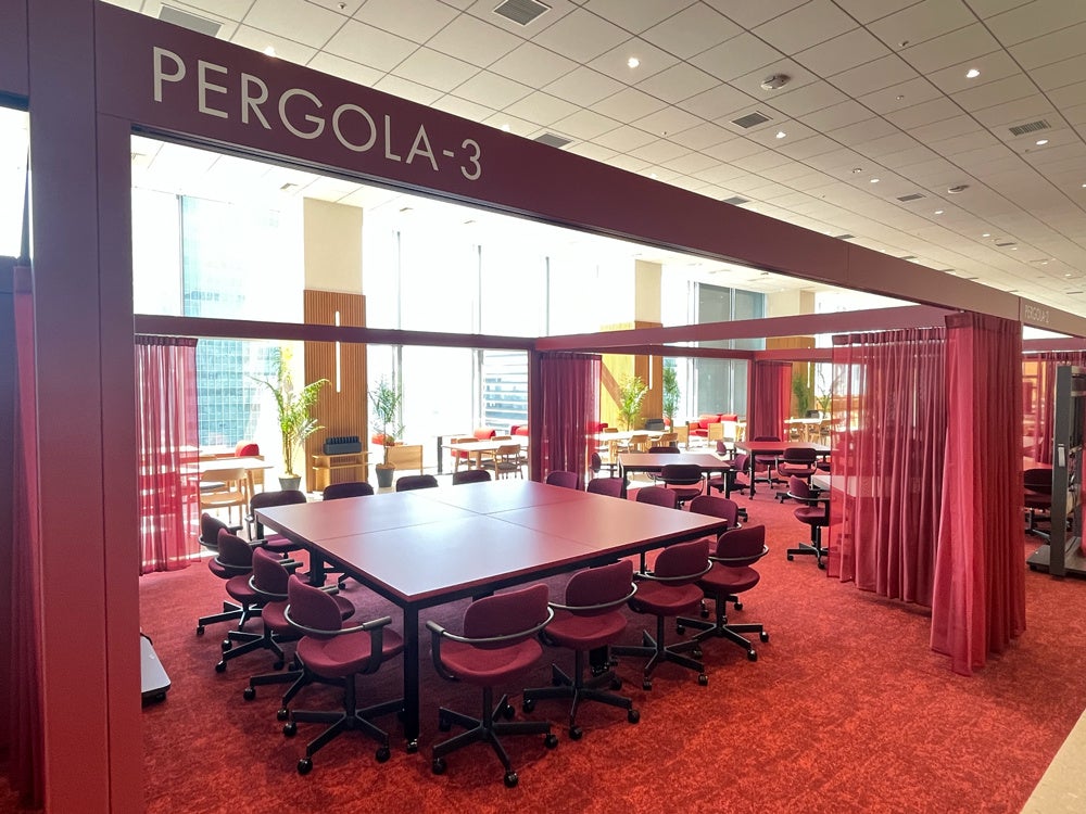▼【パーゴラ】壁がないため開放的な雰囲気を感じられる、ワークコミュニケーションスペースです。部署内・部署を超えたブレストや小規模なイベントを実施することも可能です。
