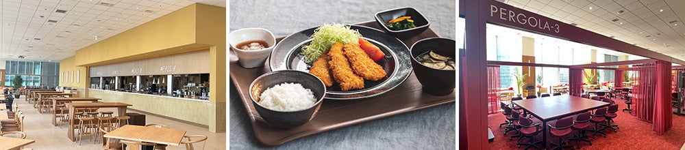 イベントなどに利用できる大人数向けの「セミナールーム」や、イベントの前後にちょっとしたコミュニケーションが取れる「ラウンジ」、壁がないシームレスな空間で使い方自由な「パーゴラ」。「ダイニング(社員食堂)」では、毎朝、昆布とかつおで出汁を取ったおみそ汁や、かまどで炊いたつやつやごはんなどこだわりのごはんを食べることができます。社外の方をお招きしやすく、会社の垣根を超えて多様な方々とつながる機会が生まれる場を目指します。