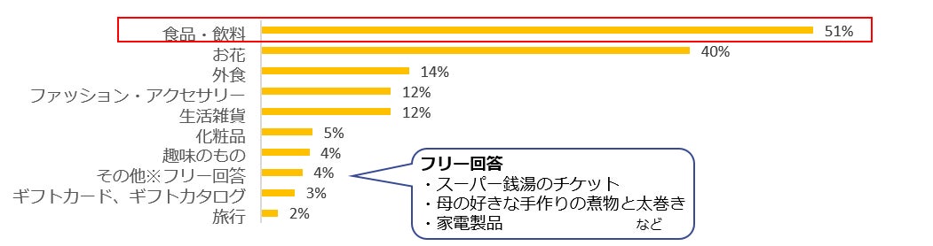 母の日と言えばカーネーションのイメージがありますが、お花を抑えて、プレゼントとして最も多かったのは「食品・飲料」という結果になりました。