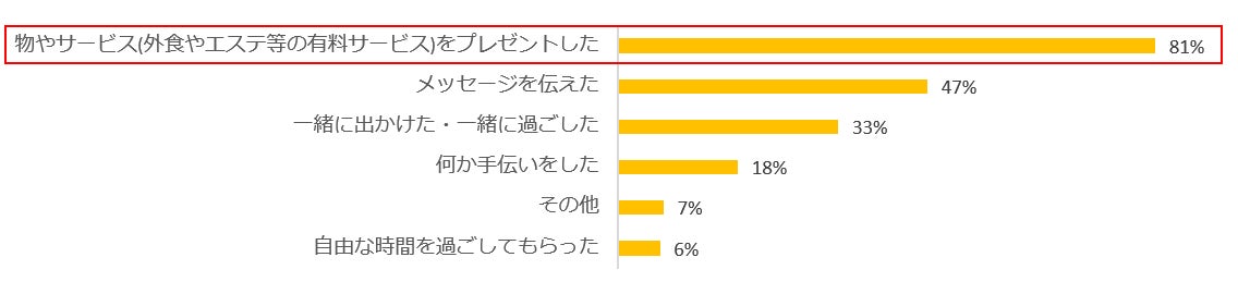お祝いの仕方としても多かったのは「物やサービスをプレゼントした」でした。